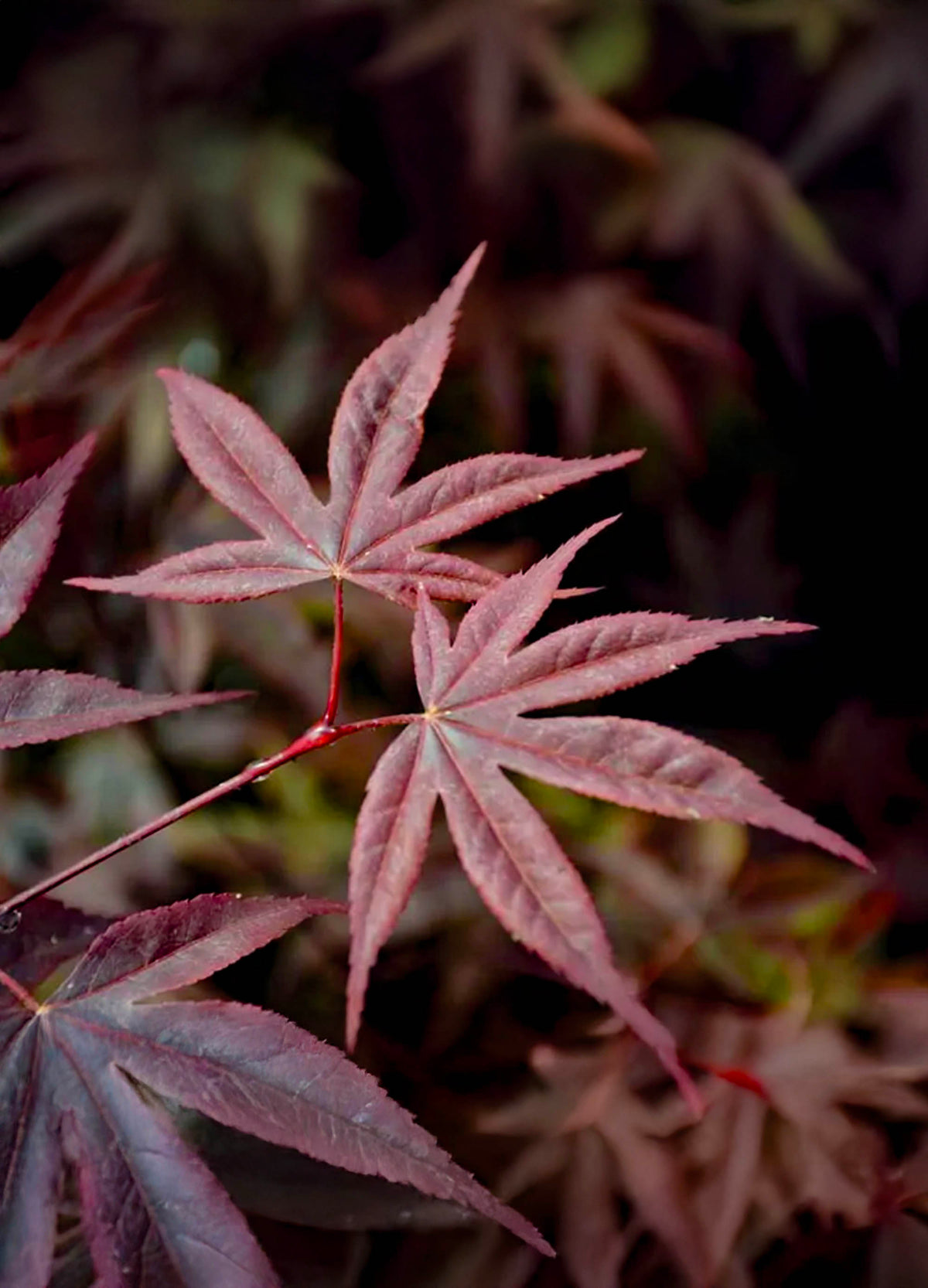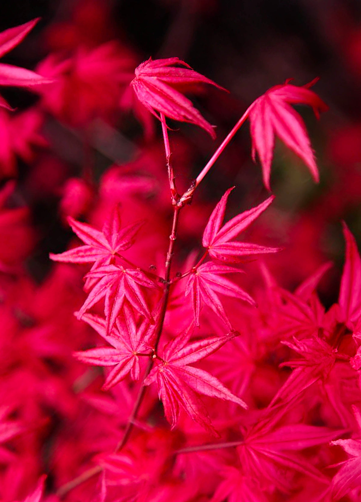 Les feuilles palmées du Fireglow, finement découpées, offrent un rouge lumineux dès le printemps. Elles se transforment en nuances sombres durant l’été, puis en tons ardents à l’automne. Ce spectacle saisonnier en fait un atout décoratif incontournable.