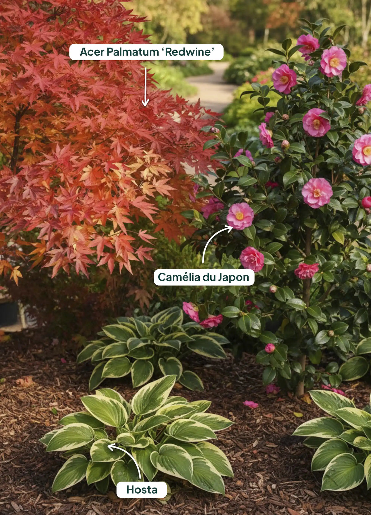 - Couvre-sols : Bruyères, hostas ou fougères décoratives.