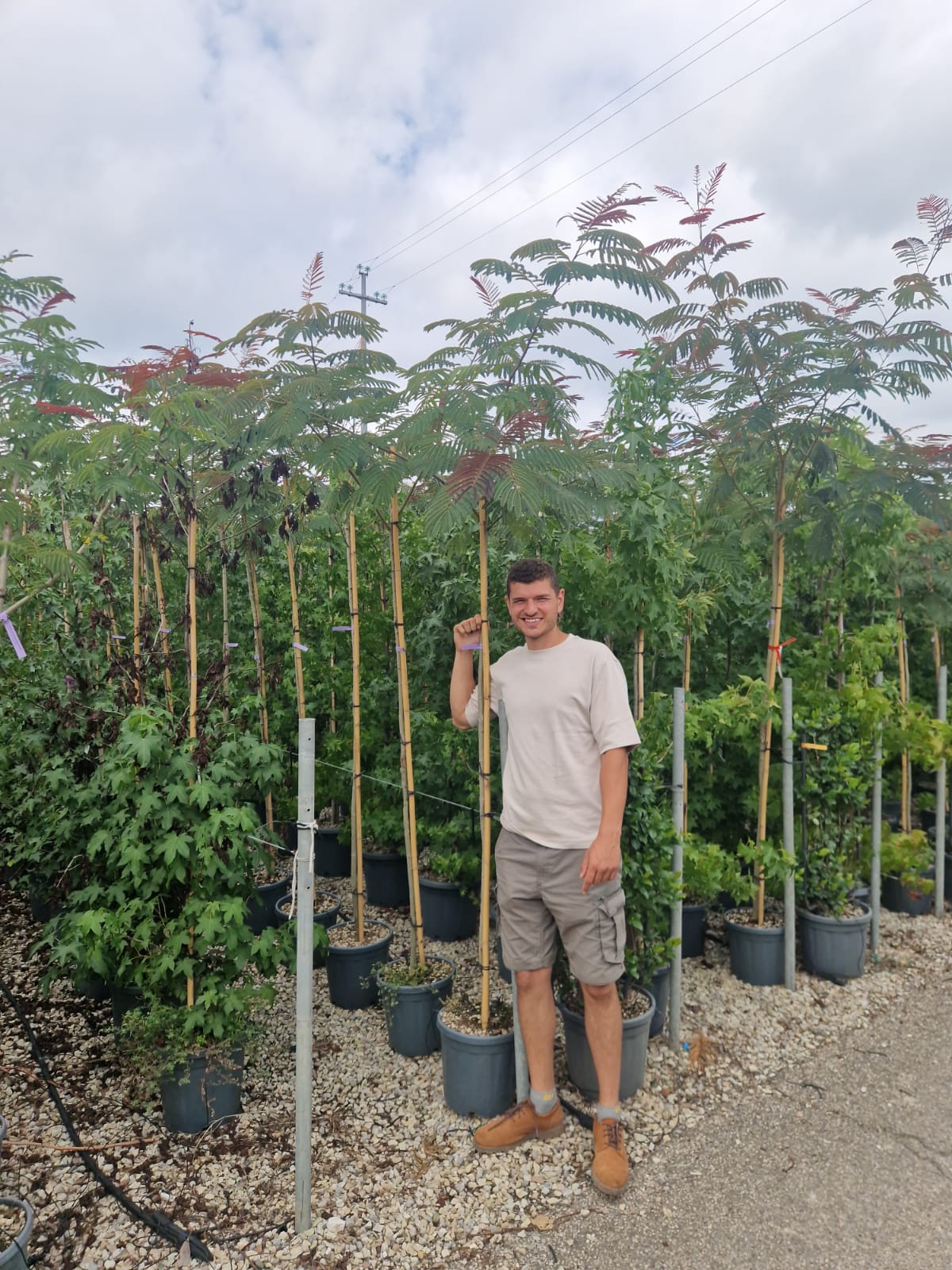 L’Albizia julibrissin ‘Evey’s Pride’, aussi appelé arbre à soie, appartient à la famille des Fabaceae. Cet arbre ornemental séduit par son port élégant, sa floraison estivale spectaculaire et son feuillage décoratif finement découpé. Il apporte une ambiance exotique et légère aux jardins. Rustique et relativement facile à cultiver, il aime les expositions ensoleillées et les sols bien drainés.