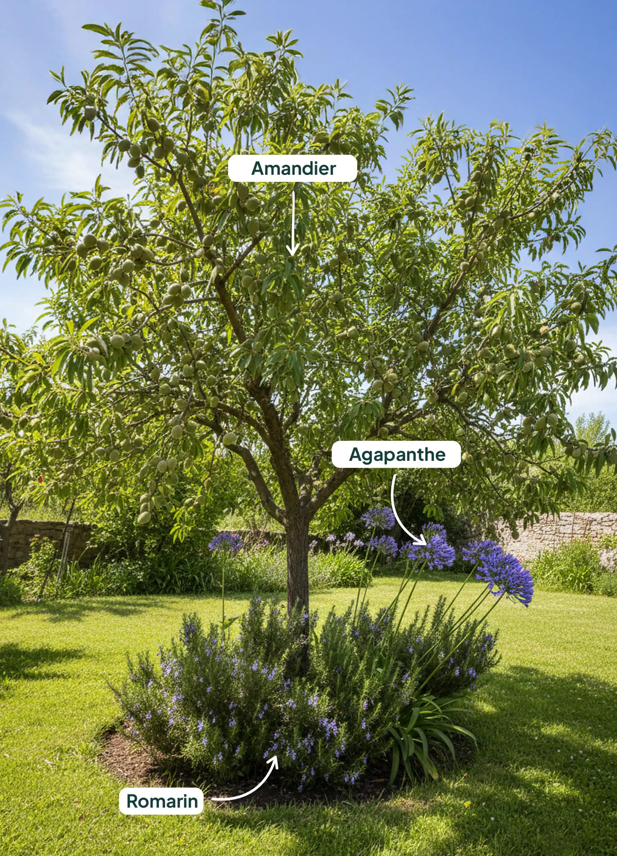 - Le Pommier (Malus domestica) : Complète l’Amandier par sa floraison printanière et ses fruits autonnaux.