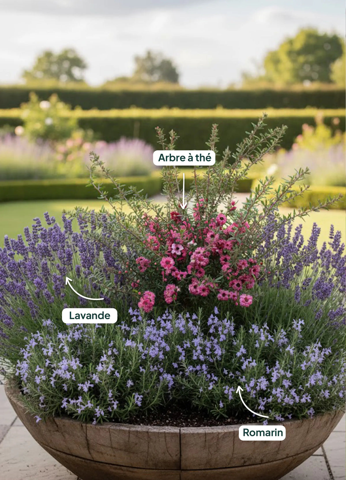 - L’Ageratum Houstonianum : Ses fleurs bleu lavande complètent les teintes de l'arbre à thé.