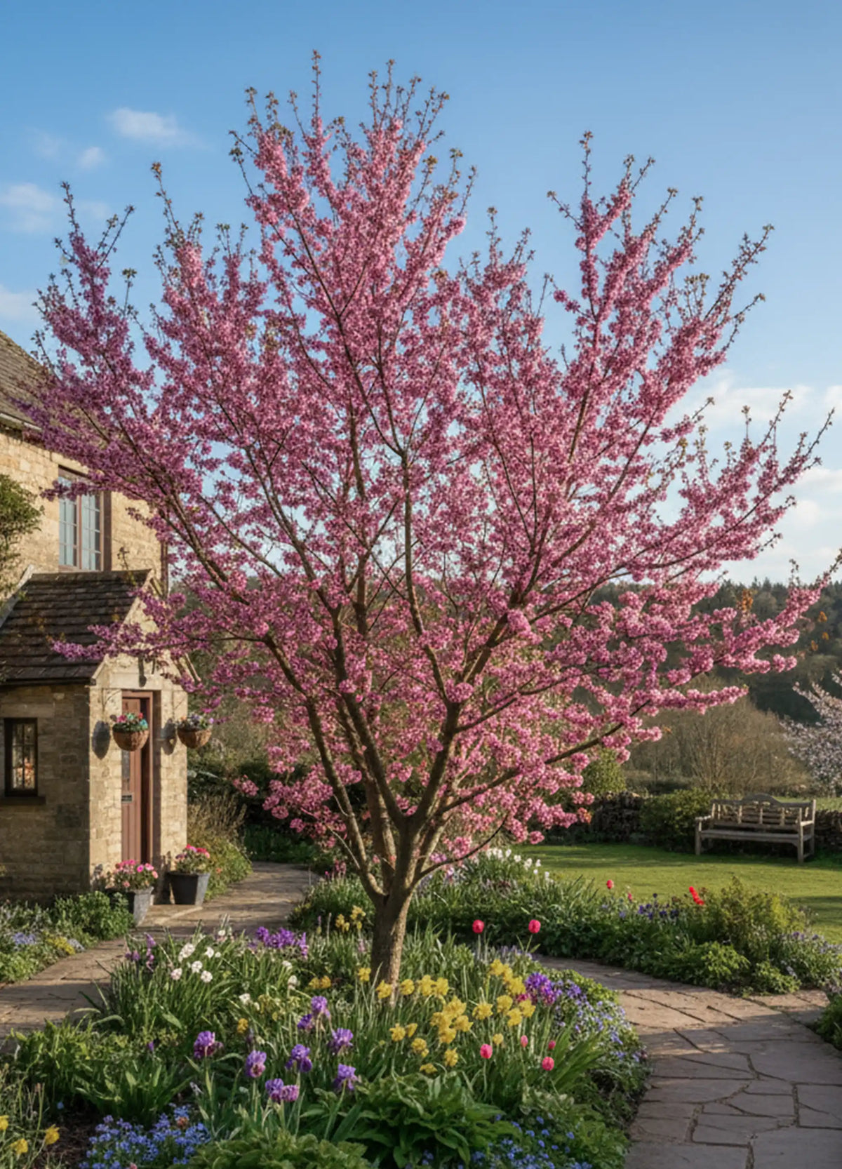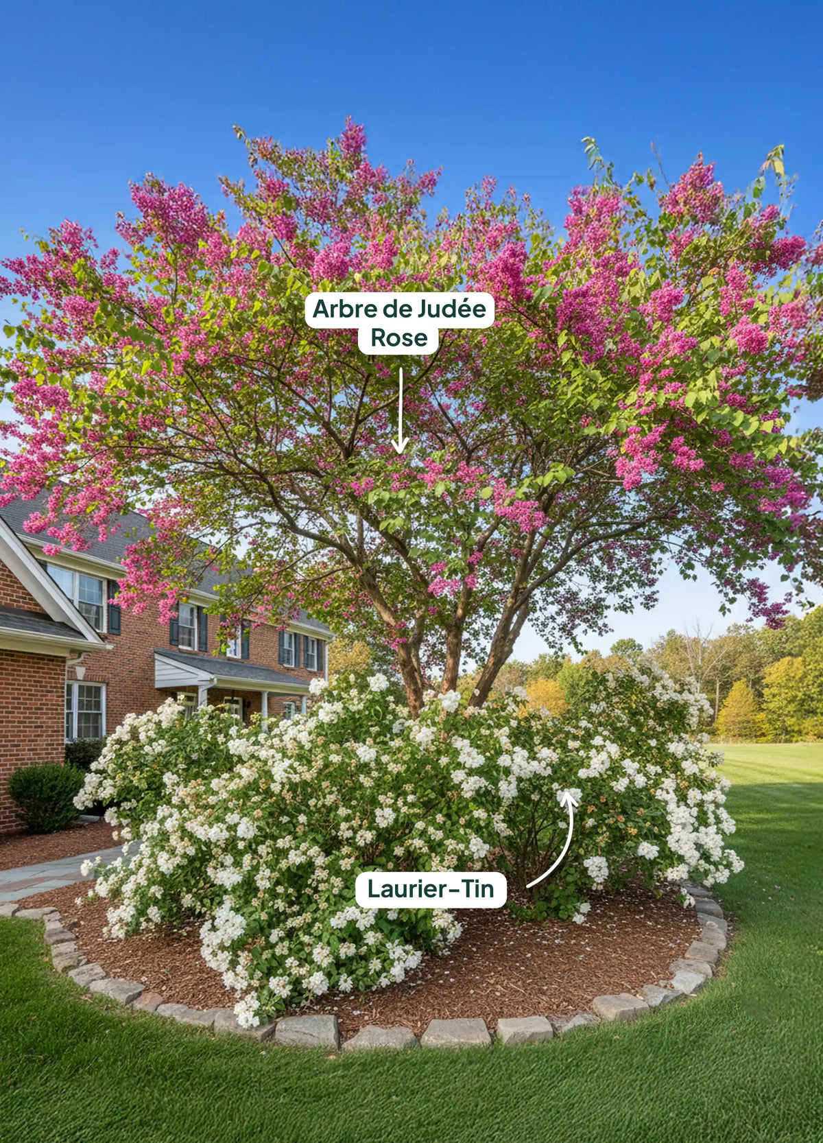 Associez-le avec des arbustes pour une harmonie florale :L'Arbre de Judée, avec ses magnifiques fleurs roses délicates, apporte une touche poétique au jardin. Pour renforcer cette élégance florale, plantez des arbustes qui mettent en valeur sa beauté naturellement douce :