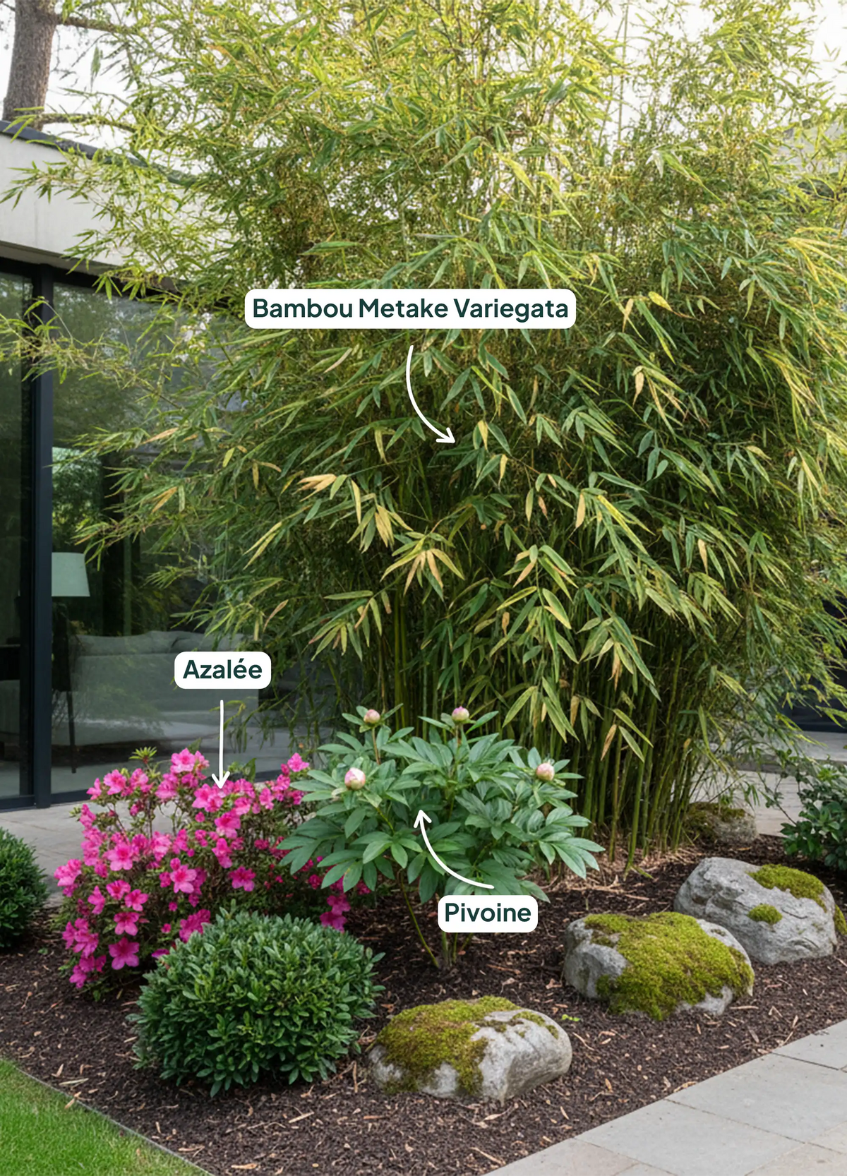 Associez-le avec des arbustes pour créer une haie texturée :Le Bambou Metake Variegata est apprécié pour son feuillage panaché et sa hauteur imposante. Associez-le à des arbustes pour jouer avec les textures et les contrastes visuels dans votre jardin :