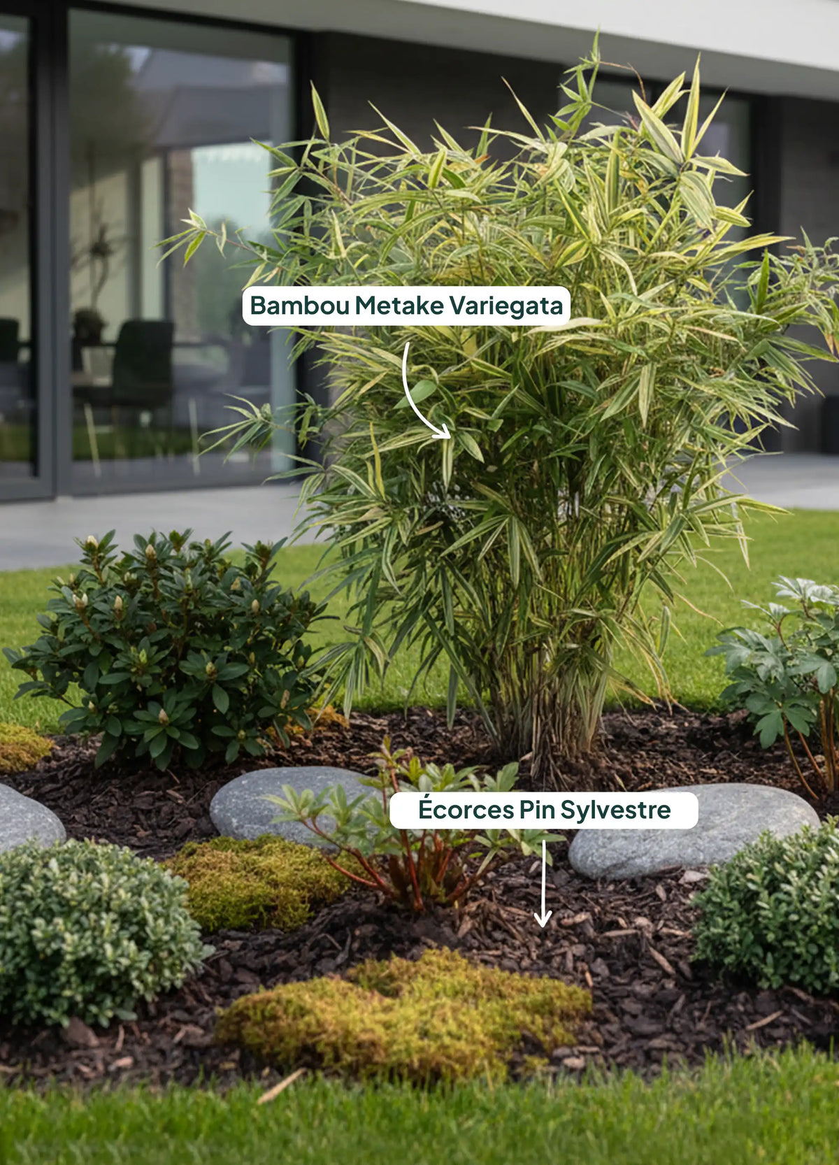 Pour maximiser l’effet décoratif du Bambou Metake Variegata, plantez des vivaces qui couvriront le sol et éviteront les adventices tout en ajoutant de la couleur :