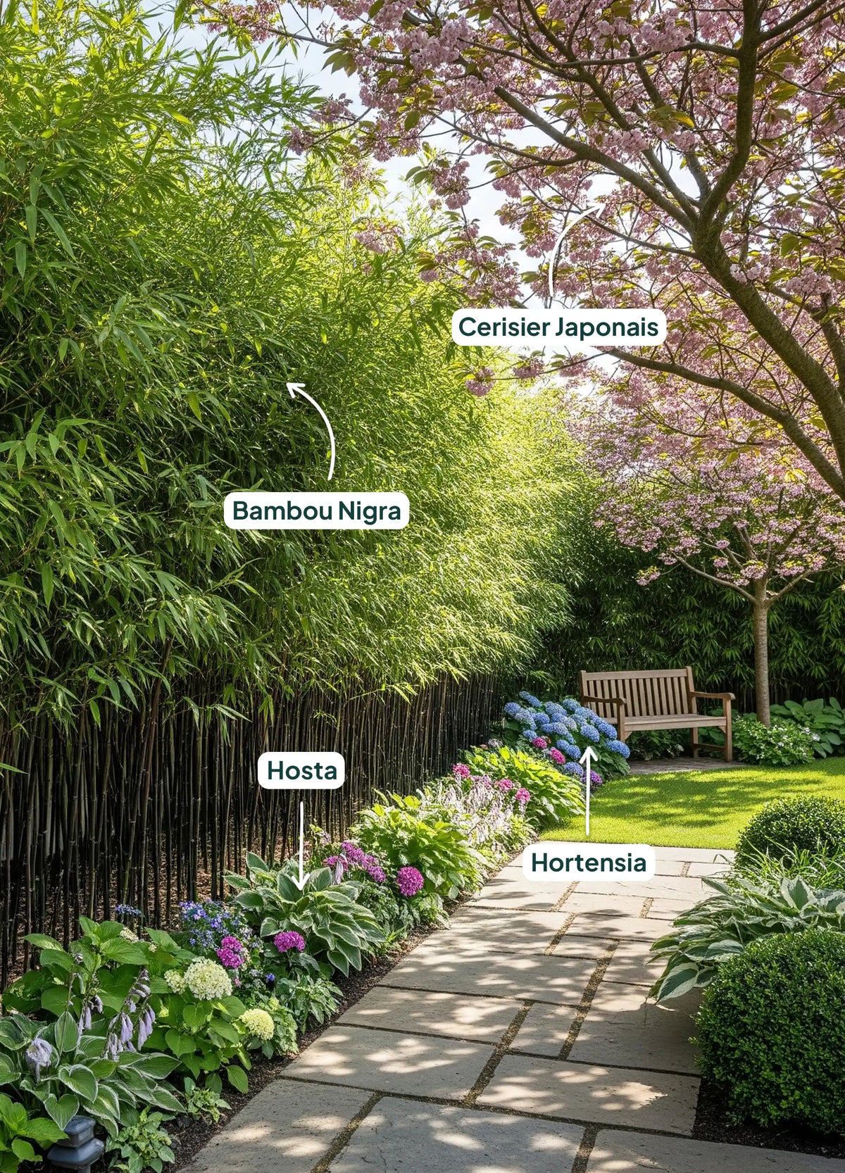 Pour habiller le pied du Bambou noir, optez pour des plantes qui non seulement complètent esthétiquement mais aussi préviennent l'érosion du sol :