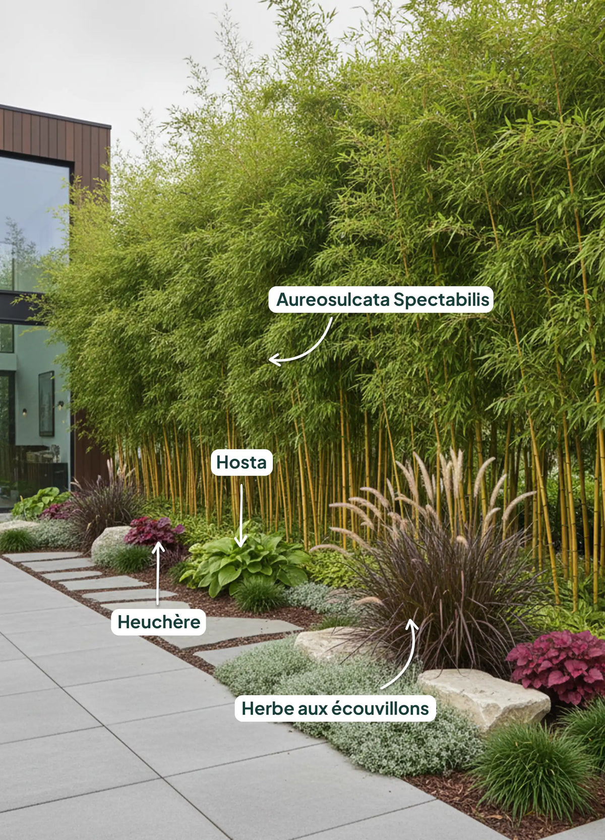Associez-le avec des arbustes pour un contraste élégant :Le Bambou Doré est prisé pour ses chaumes jaunes striés de vert. Associez-le à des arbustes qui renforcent son allure élégante et créent des contrastes visuels intéressants :