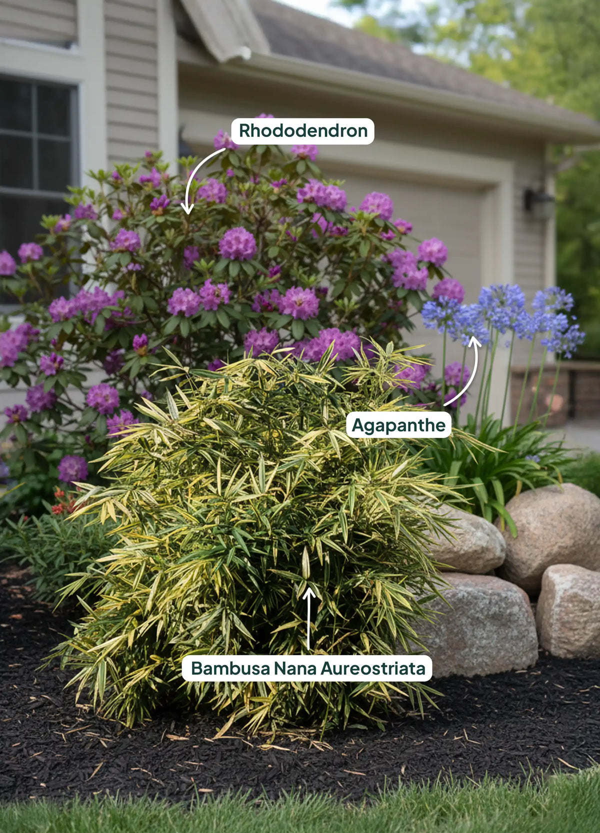 - Le Rhododendron : Fournit une floraison spectaculaire au printemps, en parfaite harmonie avec le bambou.