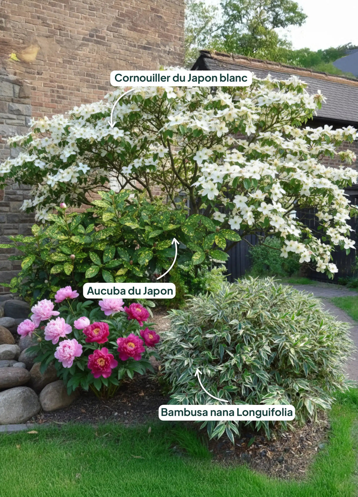 - L'Azalée (Rhododendron spp.) : Apporte une floraison colorée et un contraste avec son feuillage persistant.
