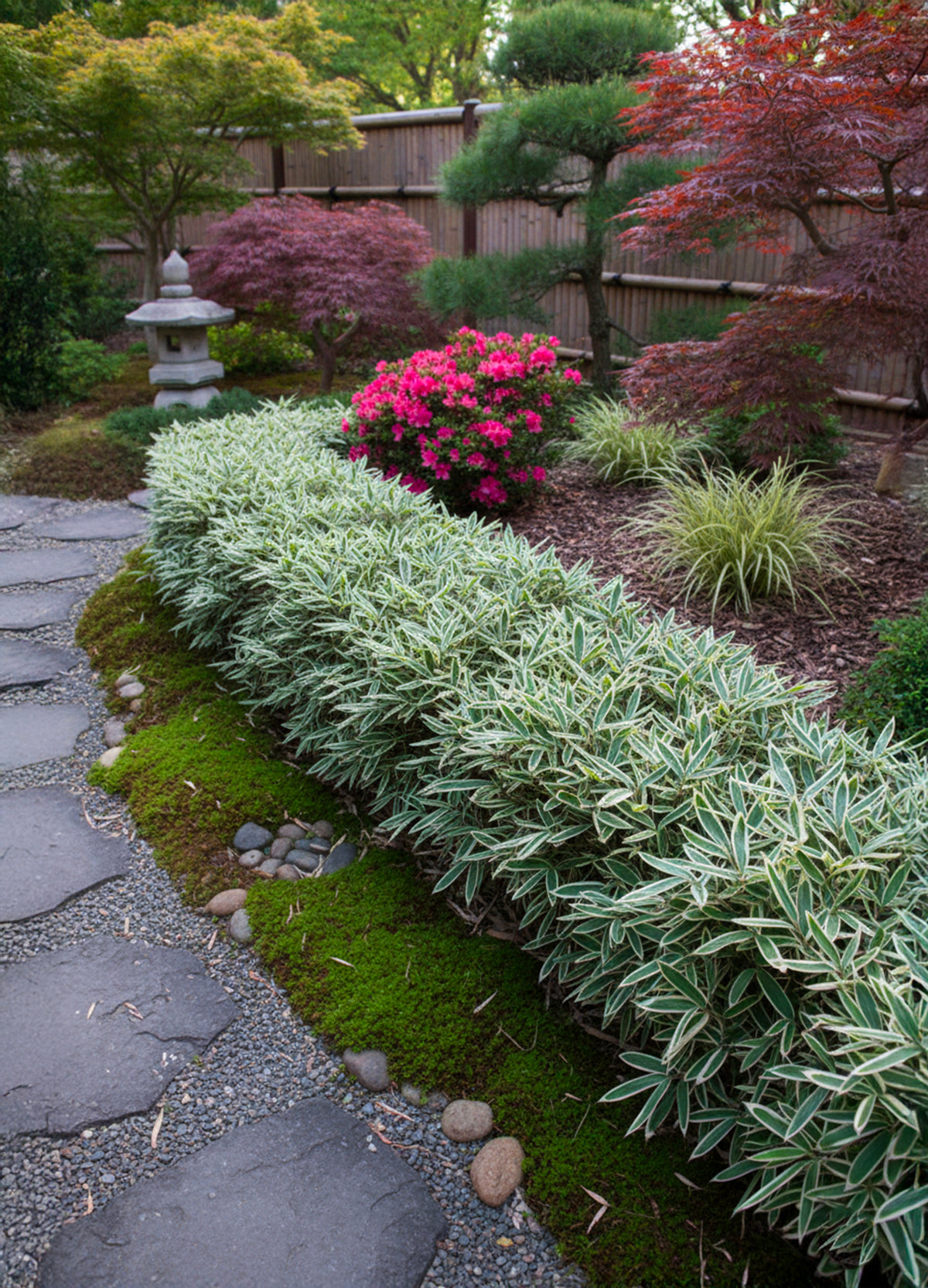 Associez-le avec des arbustes pour créer de jolis contrastes :Le Bambou Nain, avec son feuillage vert luxuriant, se marie bien avec des arbustes offrant une variabilité de textures et de couleurs :