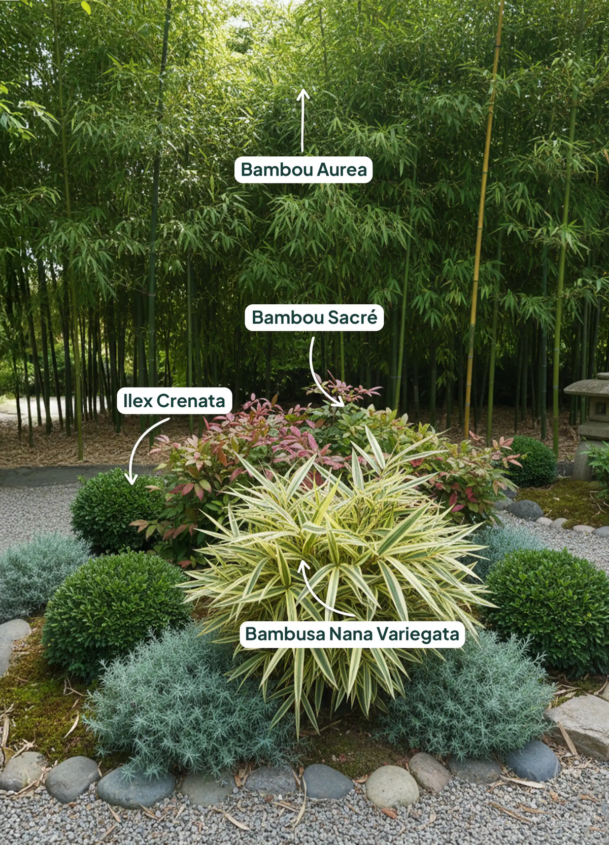 Au pied du Bambou Nain Variégé, misez sur des couvre-sol qui accentuent sa verticalité tout en protégeant le sol :