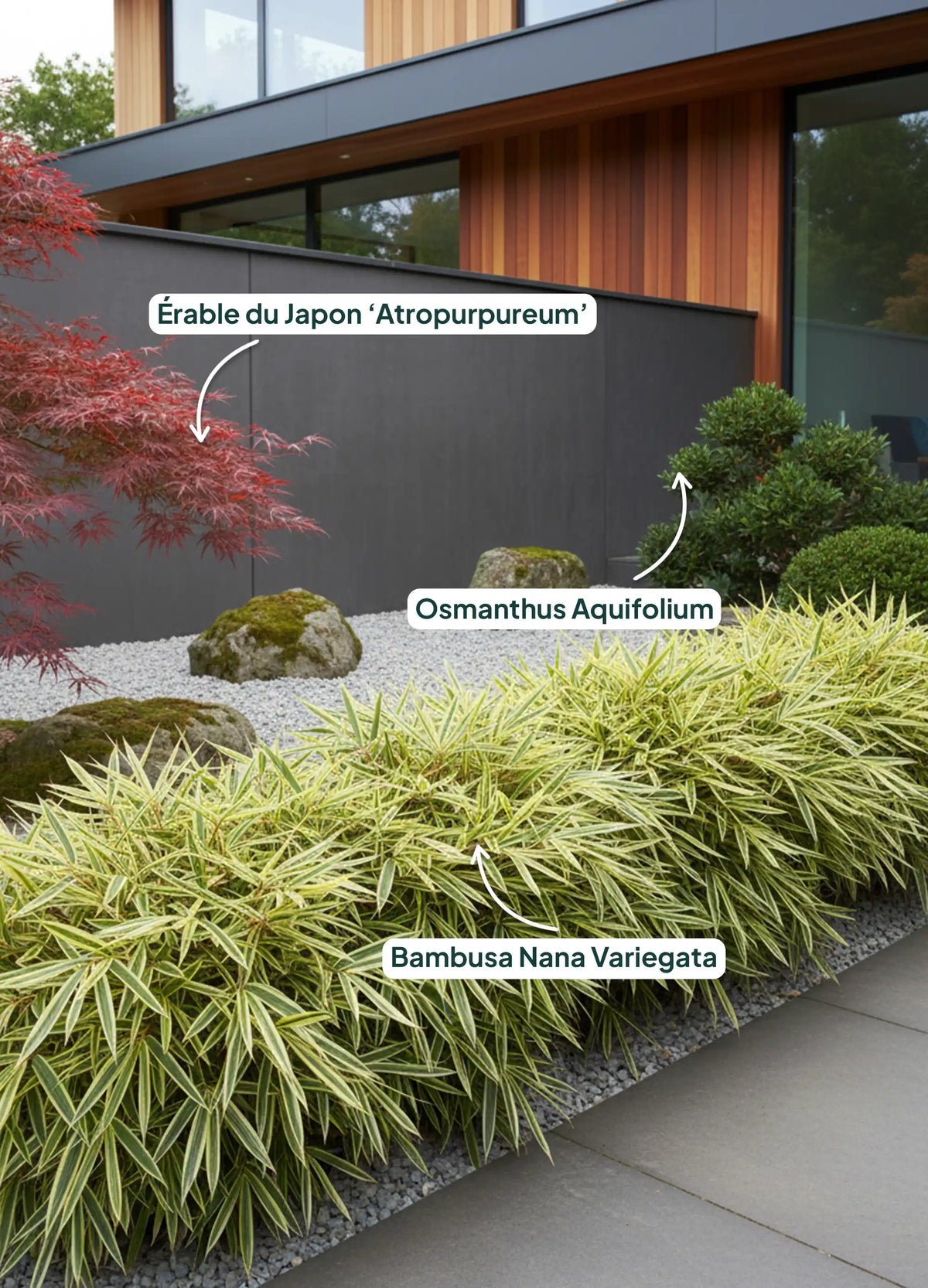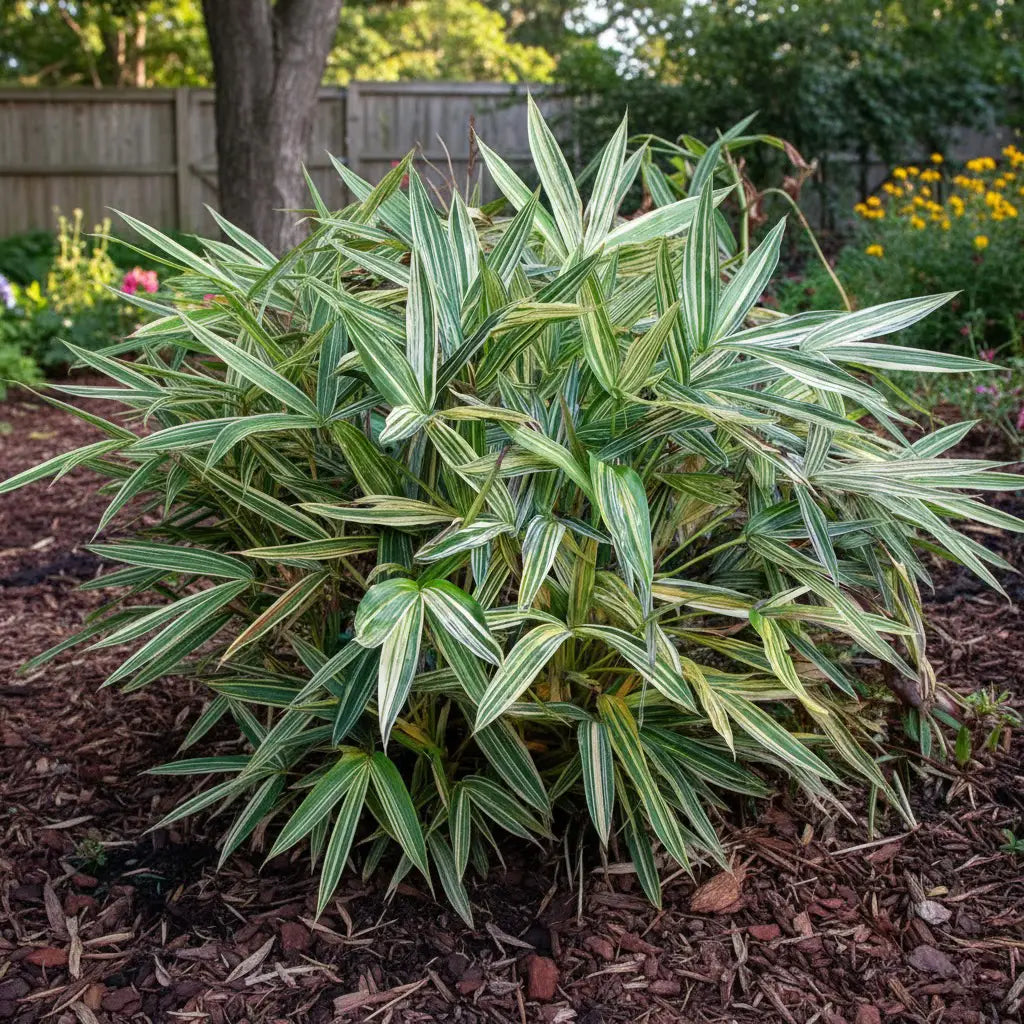 Associez-le avec des arbustes pour un jardin structuré :Le Bambou Nain Variégé se caractérise par son feuillage finement rayé de blanc, apportant une touche exotique et moderne. Pour un jardin harmonieux, associez-le à des arbustes qui mettent en valeur son feuillage lumineux :