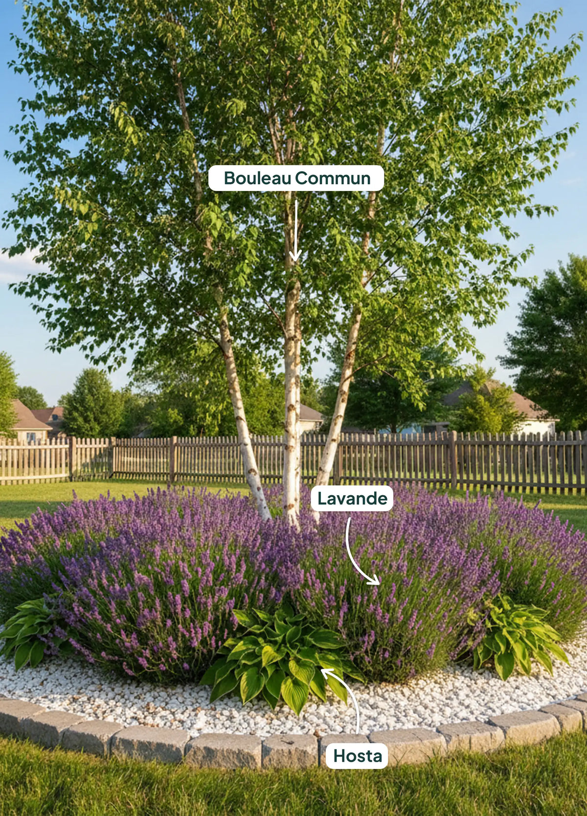 - Plantes couvre-sol : Bruyères, fougères et hostas agrémentent son pied.