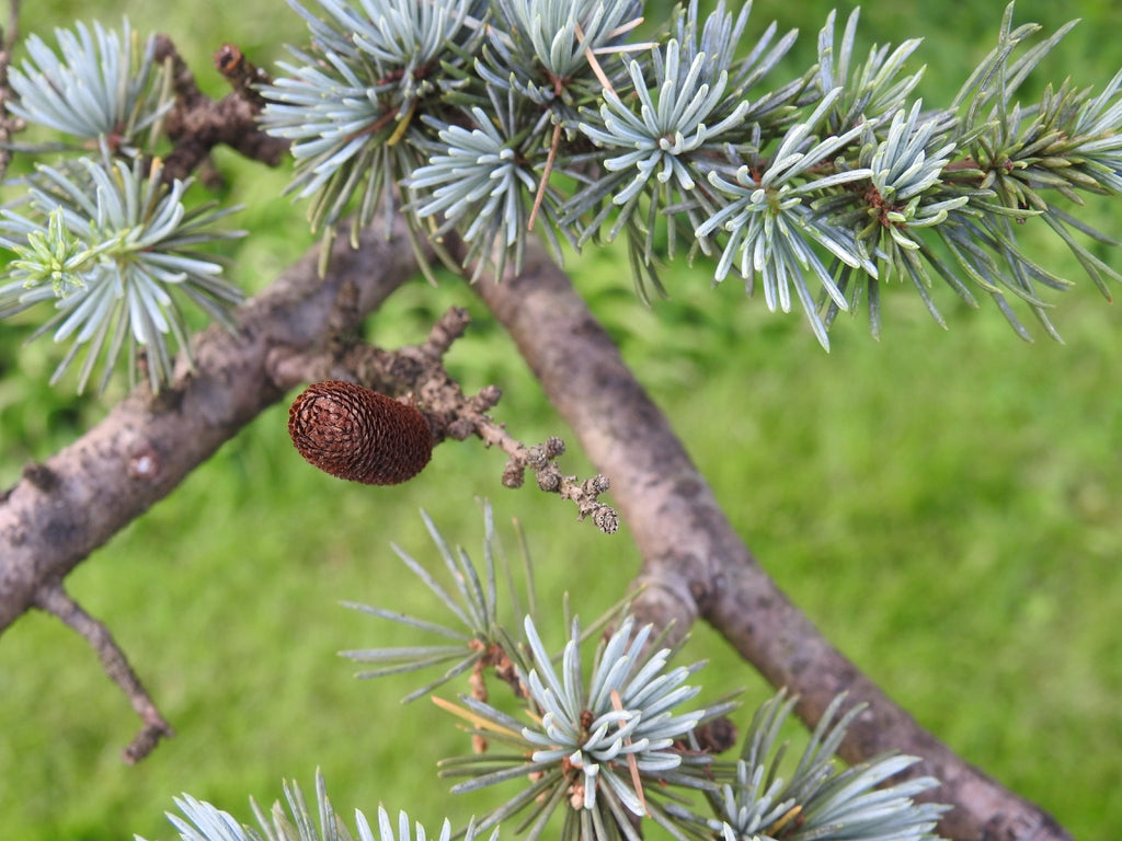 Le cèdre bleu produit des cônes dressés, ovoïdes et compactés, mesurant 5 à 7 cm de long. Ils apparaissent sur les branches en été et mûrissent en deux à trois ans. À maturité, les cônes se désagrègent pour libérer leurs graines ailées. L’arbre est monoïque, c’est-à-dire qu’il porte à la fois des cônes mâles et femelles, facilitant sa reproduction dans un jardin bien exposé.