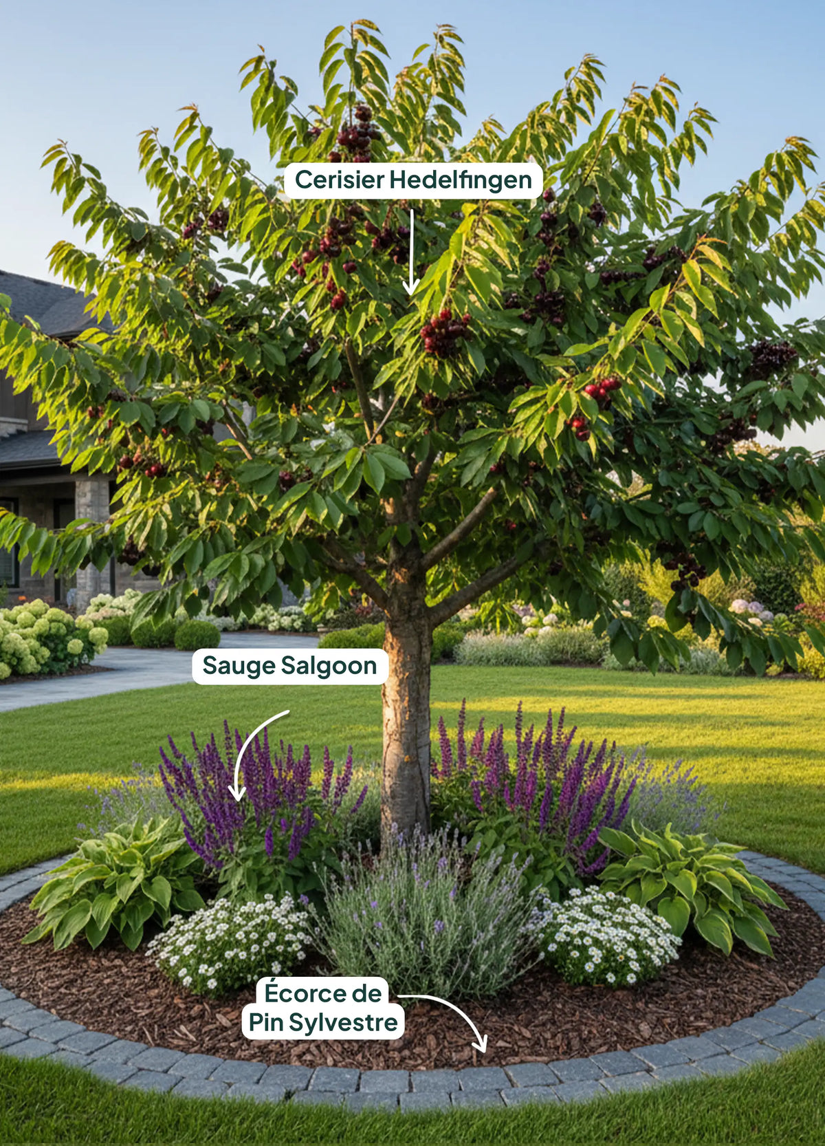 Associez-le avec des arbustes pour un verger diversifié :Le Cerisier Hedelfingen, reconnu pour ses cerises juteuses, s’épanouit dans un verger avec d’autres arbres fruitiers qui favorisent la biodiversité.