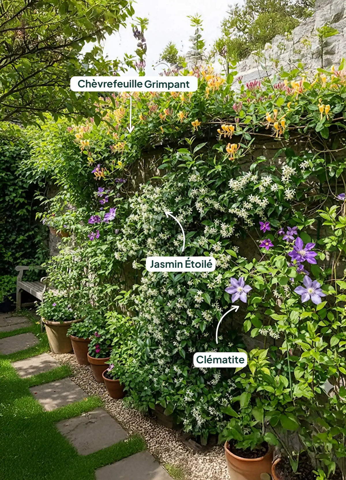 - Agrémente vos murs et treillis de ses fleurs parfumées, créant une atmosphère enchanteresse dans votre jardin