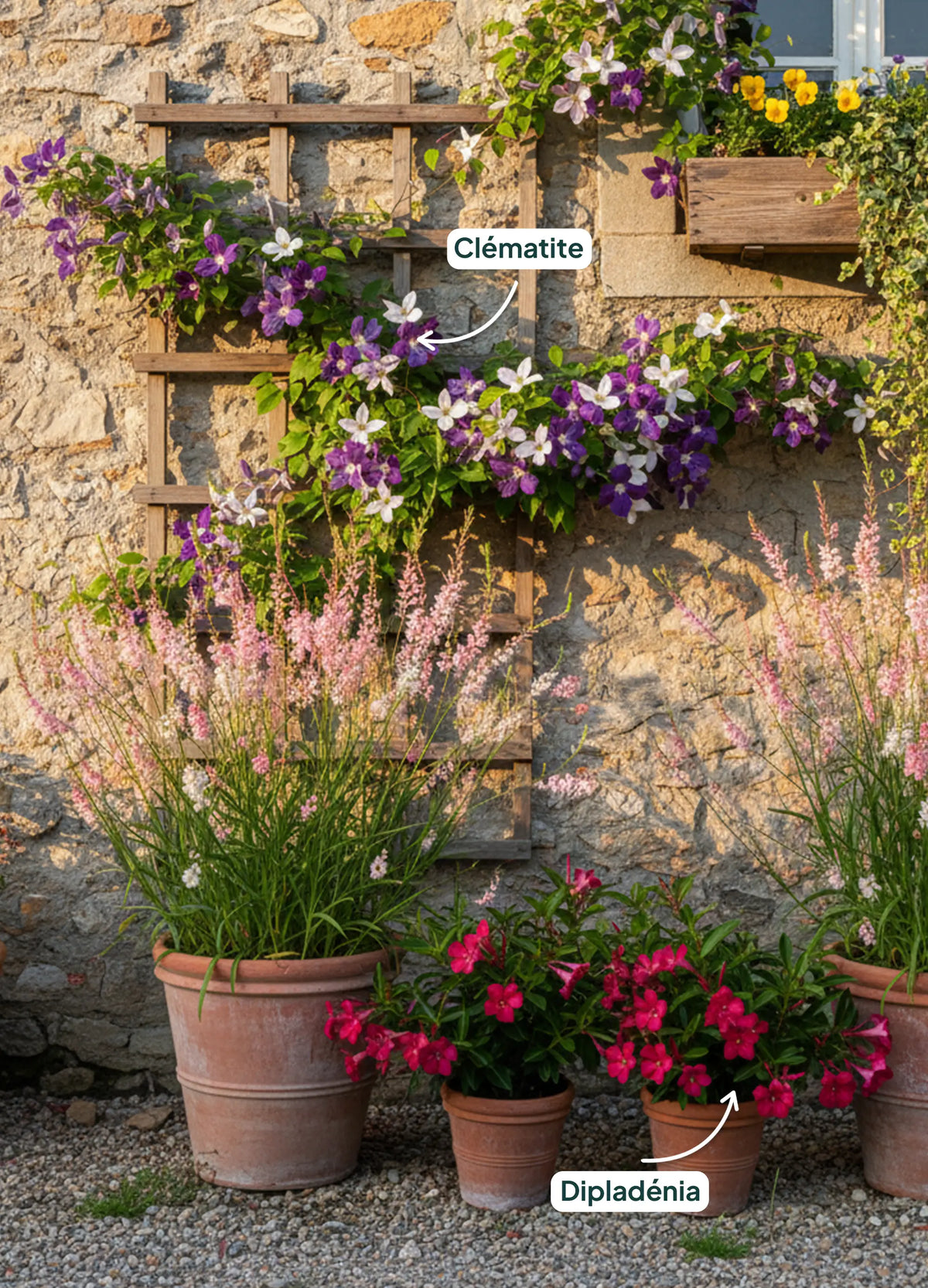 - Aromatiques : Thym rampant pour protéger et fleurir le pied.