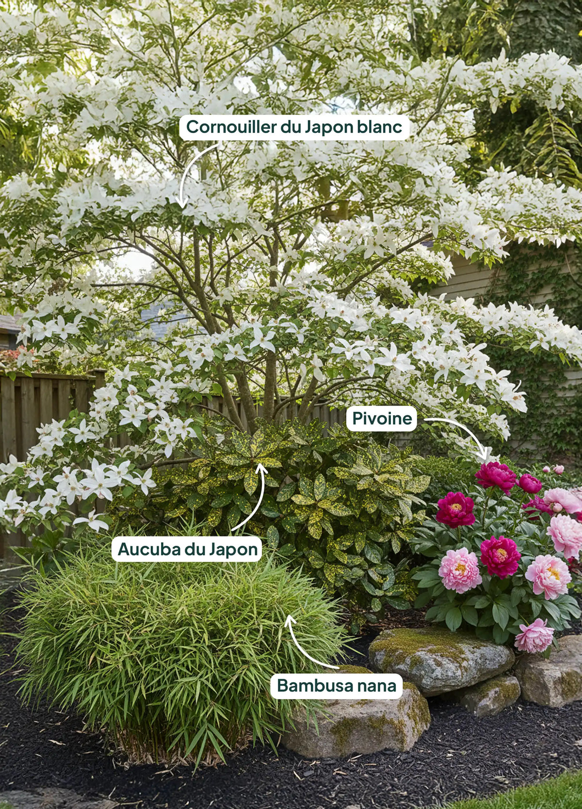 Associez-le avec des arbustes pour créer un tableau vivant :Le Cornouiller du Japon blanc, célèbre pour ses fleurs étoilées blanches au printemps et son feuillage flamboyant en automne, peut agréablement être associé à d'autres arbustes colorés pour un effet visuel époustouflant :