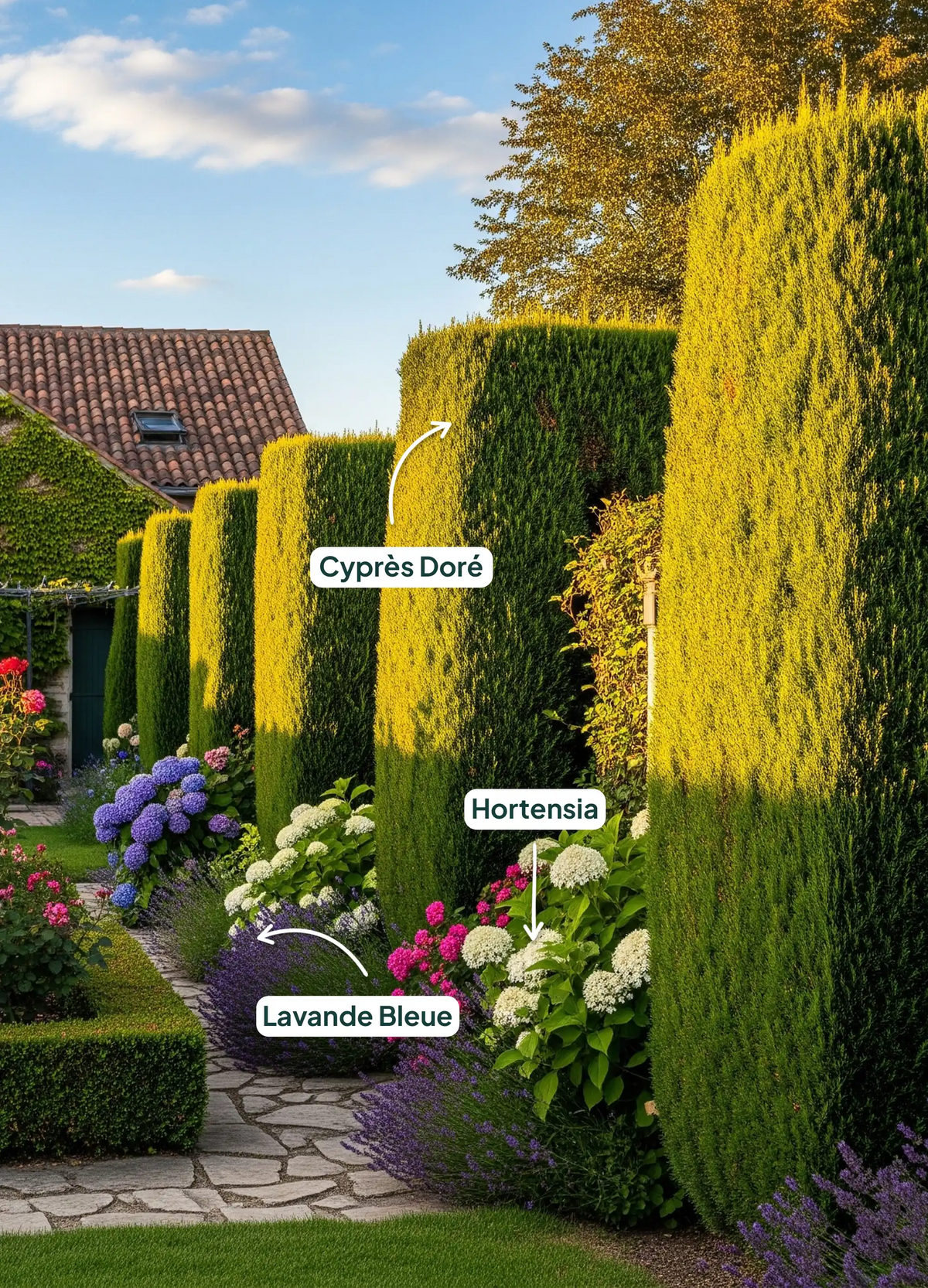 Associez-le avec des arbustes pour une harmonie visuelle :Le Cyprès Doré offre un feuillage doré lumineux et un port érigé. C'est un choix idéal pour structurer le jardin ou créer des haies distinctives. Complétez-le avec des arbustes dont les couleurs et les textures s'harmonisent ou contrastent avec son feuillage doré :