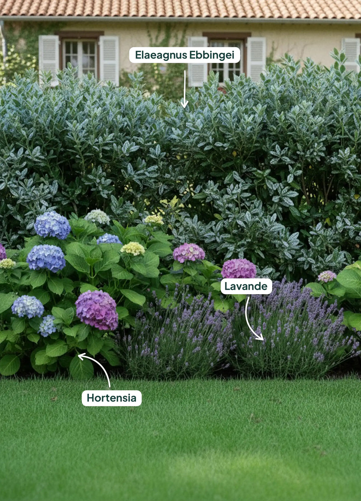 Associez-le avec des arbustes pour créer des haies variées :L'Éléagnus d'Ebbinge est un arbuste persistant connu pour ses feuilles argentées et son entretien facile. Ideal pour constituer des haies denses. Associer cet arbuste à d’autres plantes peut enrichir la diversité visuelle et apporter des nuances de couleurs supplémentaires :