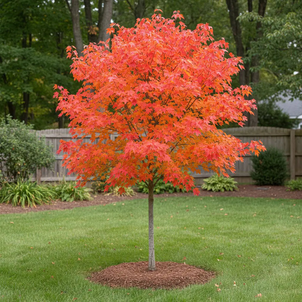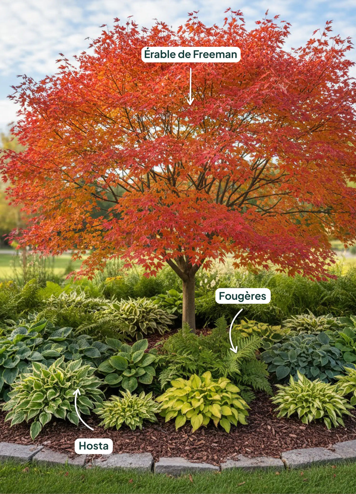 L'érable de Freeman (Acer × freemanii), issu du croisement entre l'érable argenté (Acer saccharinum) et l'érable rouge (Acer rubrum), est apprécié pour son port majestueux et son feuillage automnal flamboyant. Ses feuilles caduques, finement dentelées, prennent des teintes rouge vif à orangé intense en automne. Cet arbre vigoureux possède un tronc élancé, une croissance rapide et une excellente résistance aux sols humides. Adapté aux espaces urbains comme aux jardins, il constitue un choix de premier ordre pour les alignements ou les zones ombragées.