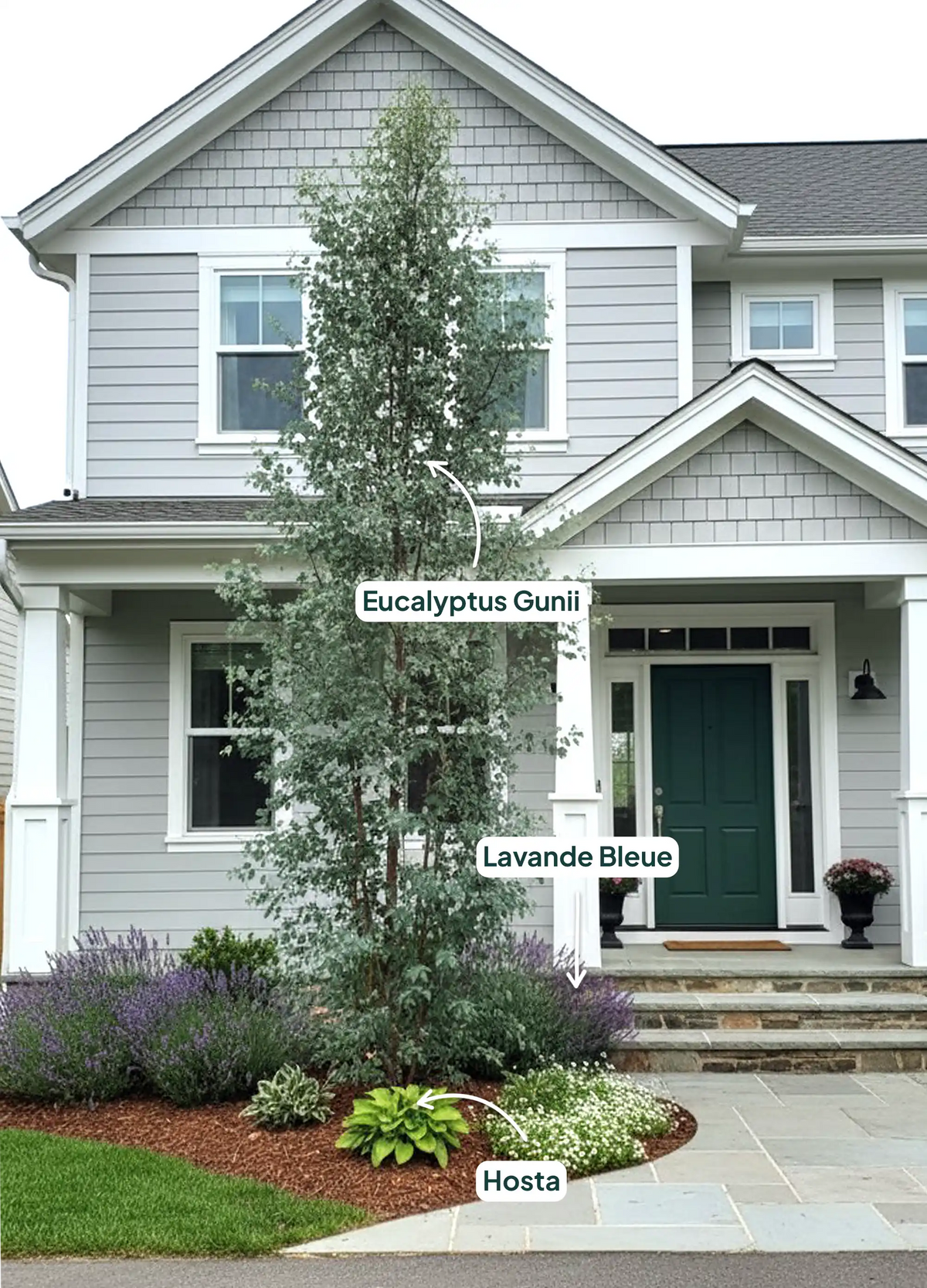 - La Lavande (Lavandula angustifolia) : Son parfum et ses fleurs violettes se mêlent bien à l'arôme de l'eucalyptus.