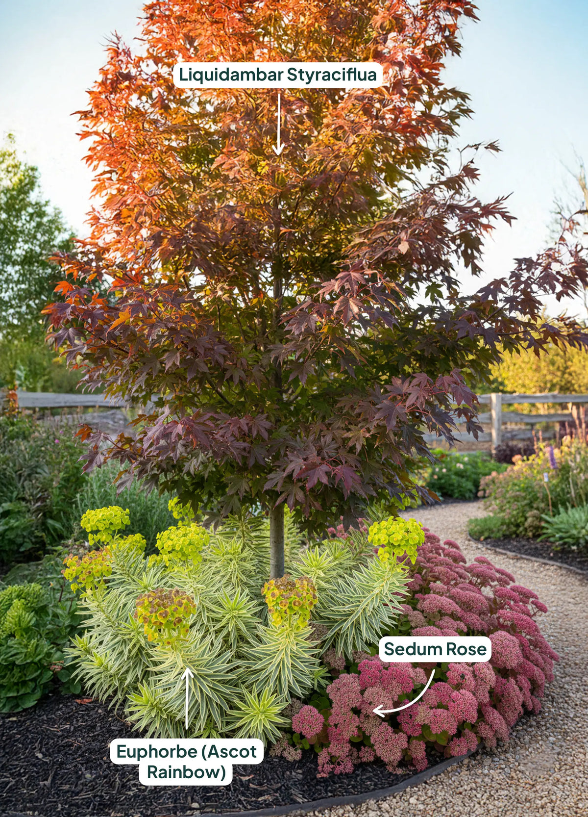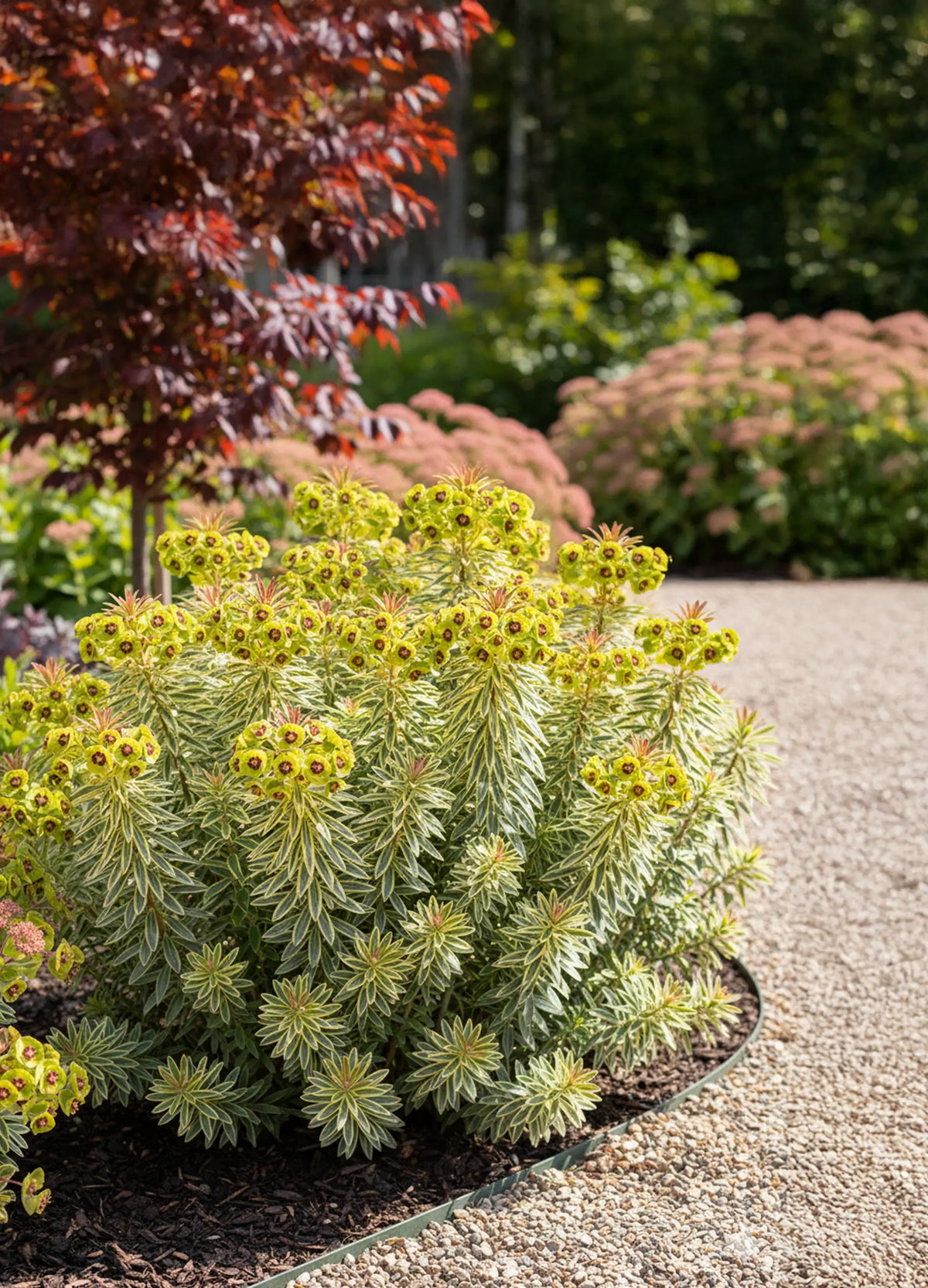 Laisser l'Euphorbe se mêler à des vivaces renforce son attrait visuel et protège le sol. Voici quelques exemples qui font ressortir son élégance :