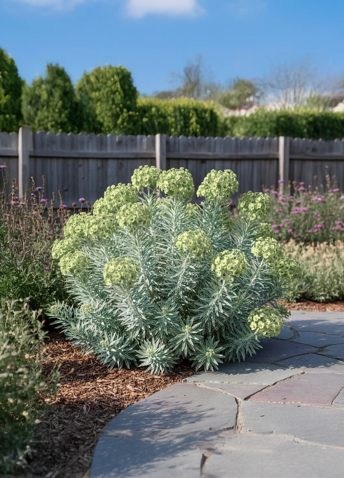 Associez-la avec des arbustes pour un contraste visuel :L'Euphorbe se distingue par ses tiges denses et son feuillage vert bleuté. Associez-la à des arbustes dont les couleurs et les textures contrastent pour enrichir votre jardin :