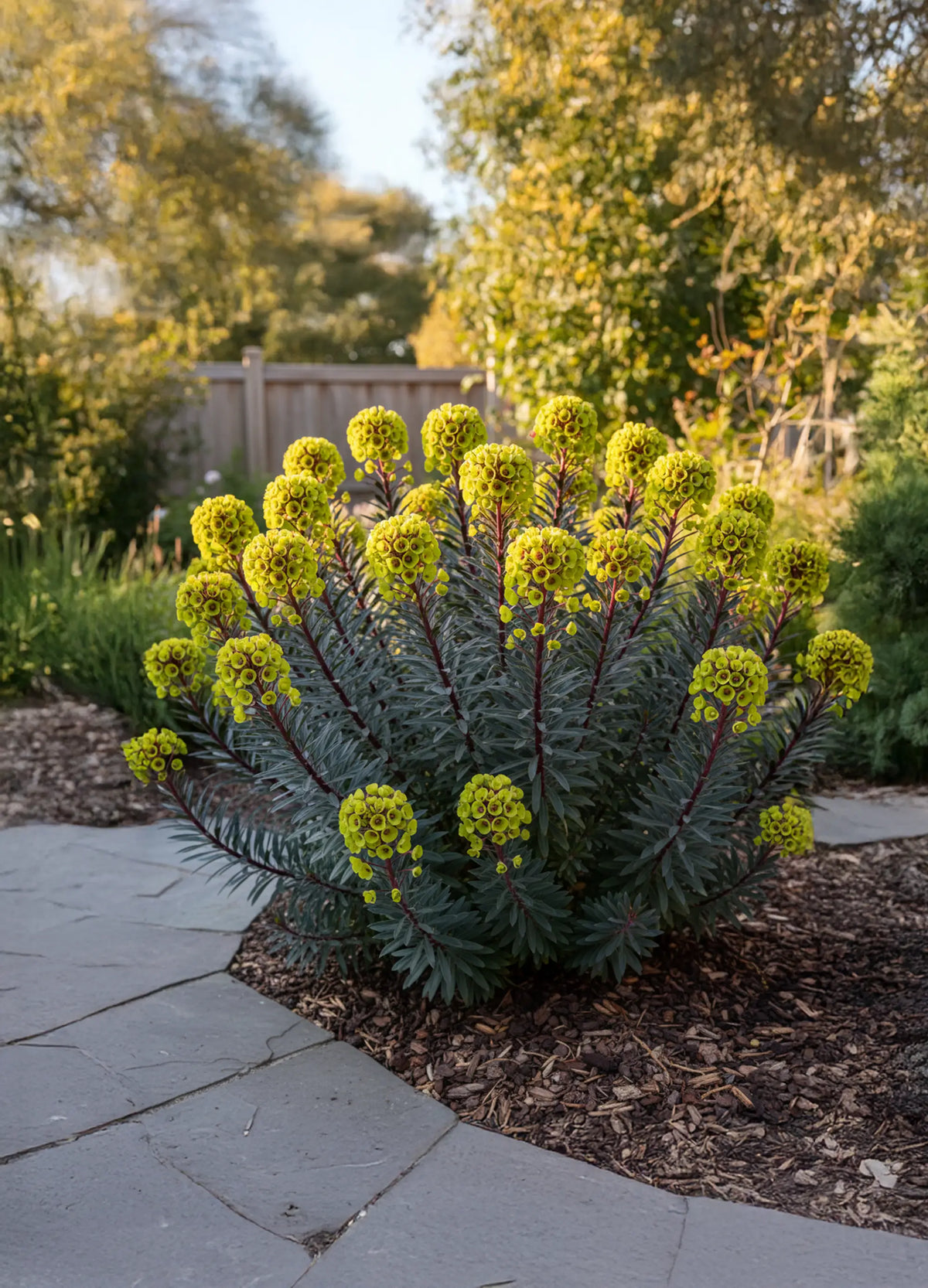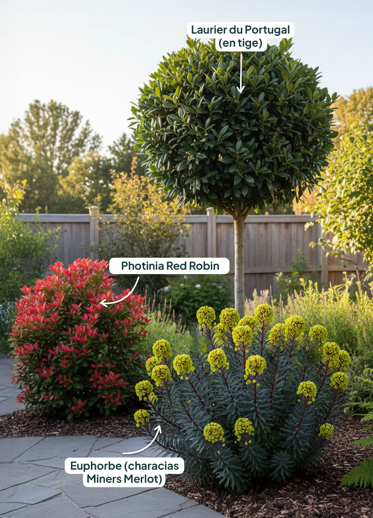 - Le Genêt (Cytisus scoparius) : Offre une floraison jaune vive qui illumine et met en valeur le feuillage sombre de l'Euphorbe.