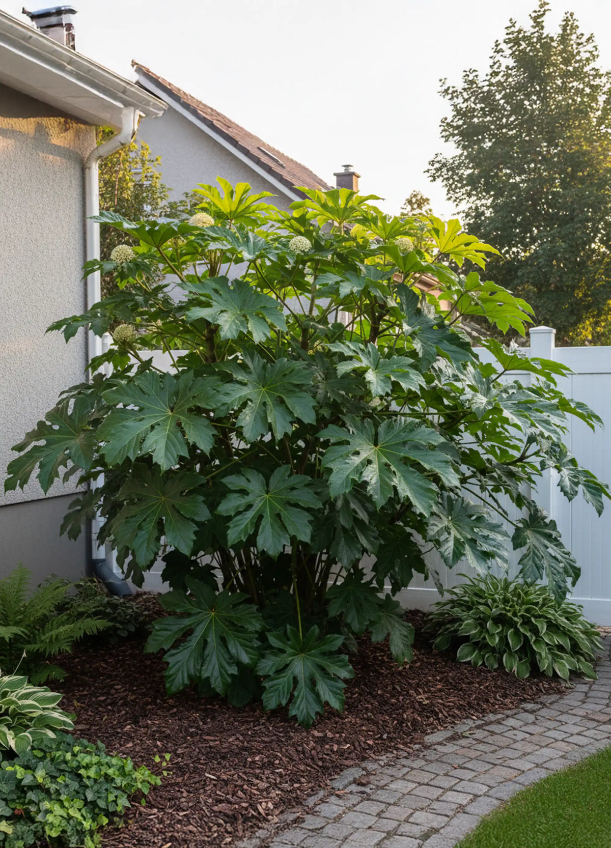 Associez-la avec des arbustes pour un contraste original :L'Aralia du Japon, ou Fatsia japonica, est prisée pour son feuillage large et brillant. Associez-la à des arbustes contrastants pour accentuer sa prestance dans votre jardin :