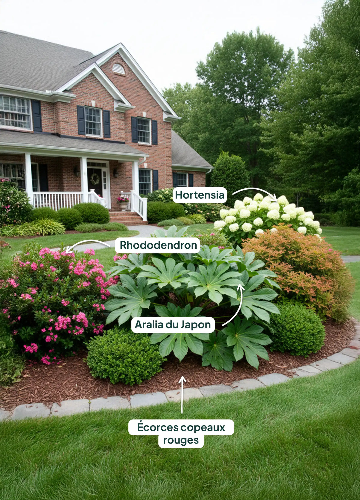 - L’Hortensia (Hydrangea macrophylla) : Avec ses fleurs généreuses, il adoucit le feuillage massif de l'Aralia.