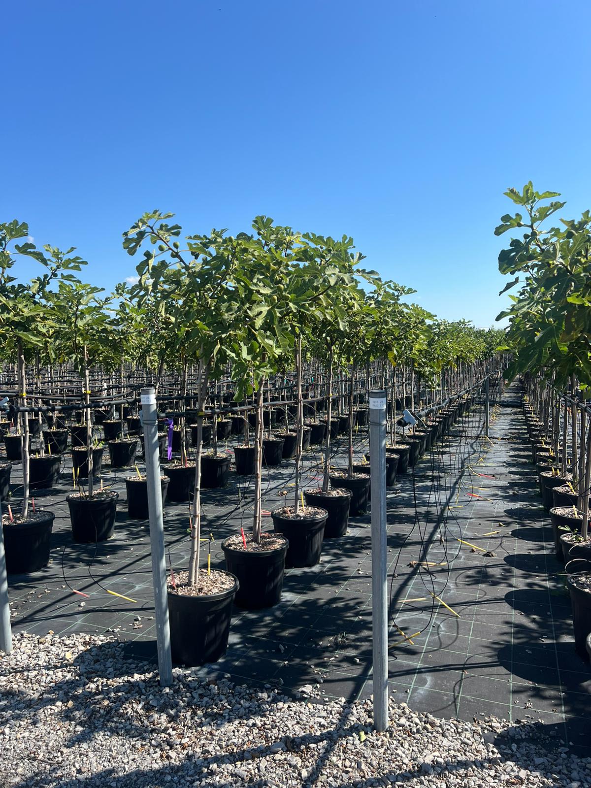 Le Figuier Grise de Saint-Jean se distingue par son feuillage large et lobé, d'un vert intense, qui peut atteindre jusqu'à 25 centimètres de long. À maturité, cet arbre peut atteindre 3 à 10 mètres de hauteur, créant un bel ombrage grâce à sa couronne touffue. La floraison de cette espèce est assez discrète, mais c'est la production de ses figues qui capte l'attention. Les figues, qui se forment à l'aisselle des feuilles, se développent toute l'été pour mûrir à la fin de l'été ou au début de l'automne, offrant une véritable surprise gustative.