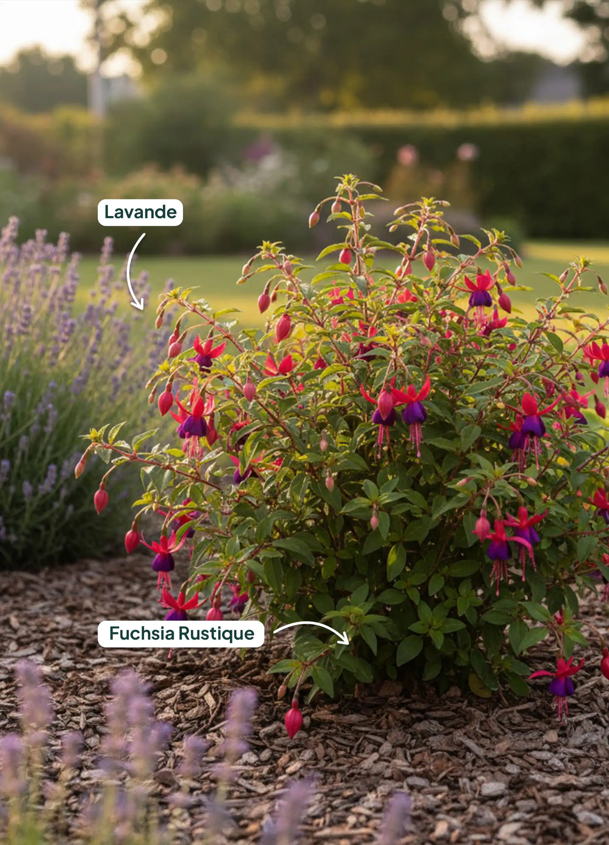 Associez-le avec des arbustes pour un cadre coloré :Le Fuchsia rustique, avec ses fleurs aux teintes éclatantes, apprécie les coins ombragés et abrités. Associez-le à des arbustes qui sauront mettre en valeur ses tons vibrants :