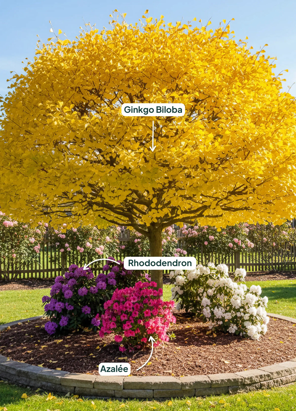 Associez-le avec des arbustes pour un contraste unique :Le Ginkgo biloba, avec son feuillage doré en automne, est une merveille pour les yeux. Il se marie particulièrement bien avec certains arbustes pour créer un jardin harmonieux et coloré :