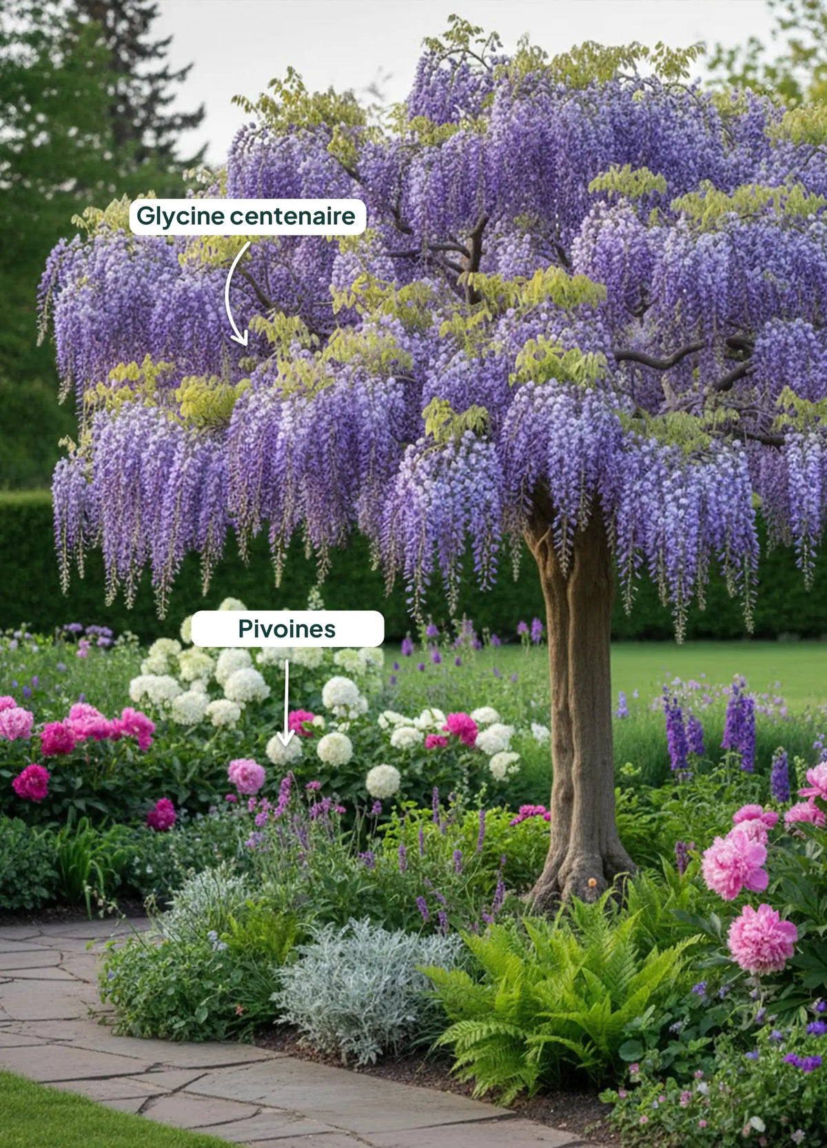 Associez-la avec des arbres et arbustes pour un jardin élégant :La Glycine Centenaire, célèbre pour ses longues grappes de fleurs parfumées, apporte une touche majestueuse à votre jardin. Pour enrichir ce cadre, introduisez des arbres et arbustes qui mettront en valeur sa beauté :