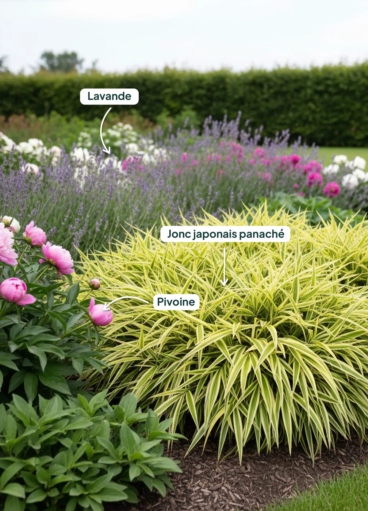 Pour renforcer l'aspect naturel et apaisant autour du Jonc japonais panaché, choisissez des vivaces adaptées aux zones humides :