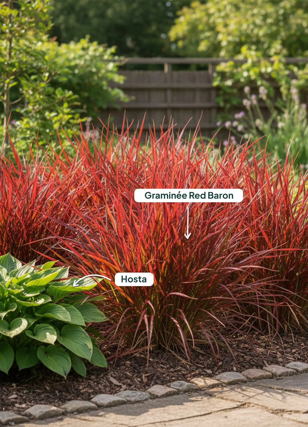 La Graminée Red Baron (Imperata cylindrica) est idéale à planter au printemps ou à l'automne. Ces périodes permettent à la plante de s'établir avant les extrêmes de température hivernale ou estivale. Assurez-vous qu'elle soit placée dans un sol bien drainé et exposée au soleil pour garantir une bonne croissance et des couleurs vives.