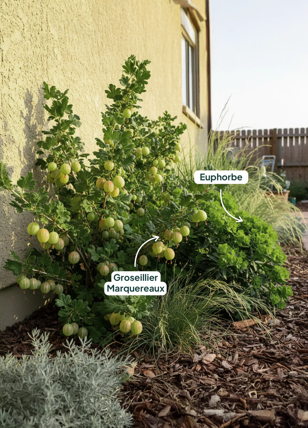 Associez-le avec des arbustes pour un jardin diversifié :Le Groseillier Marquereaux est un arbuste fruitier apprécié pour ses petits fruits juteux. Il se plaît en pleine lumière et préfère les sols légèrement acides à neutres. Pour enrichir visuellement votre jardin tout en favorisant une bonne cohabitation, vous pouvez l'associer avec :