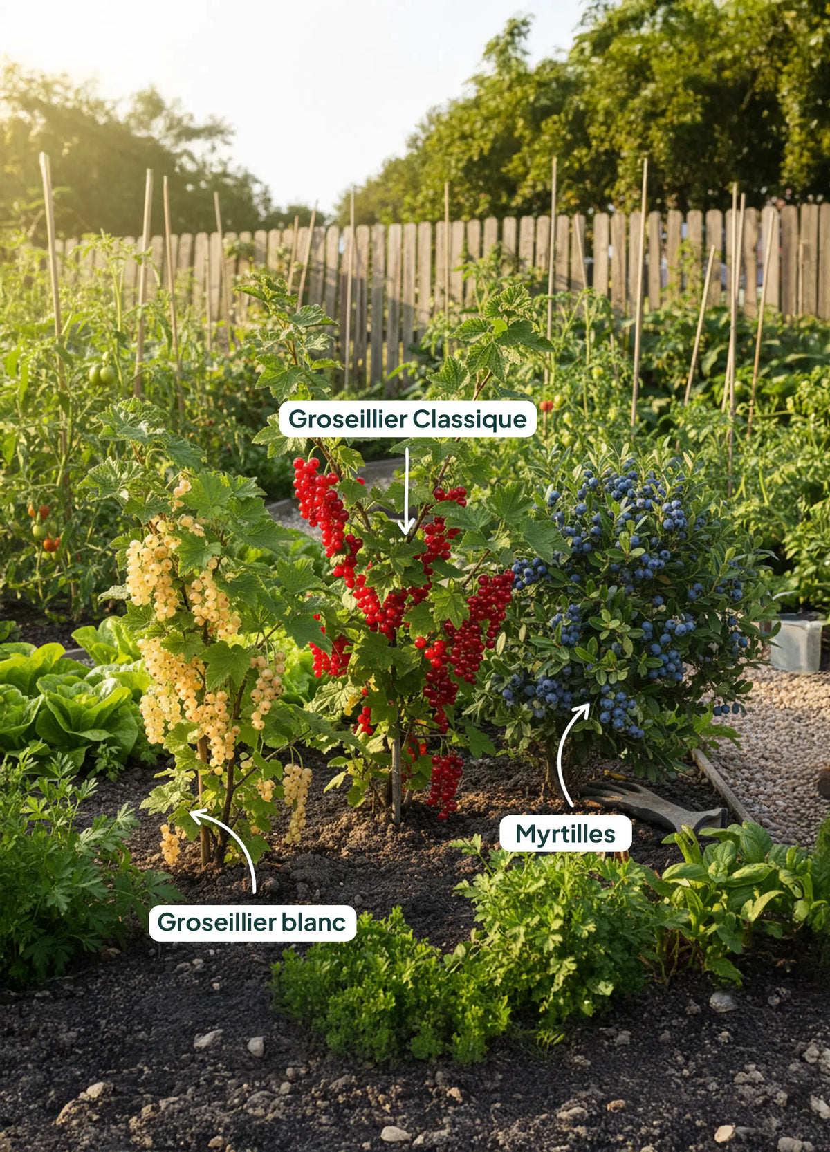 - Le Cassis (Ribes nigrum) : Propose des baies riches en vitamine C pour compléter vos récoltes.
