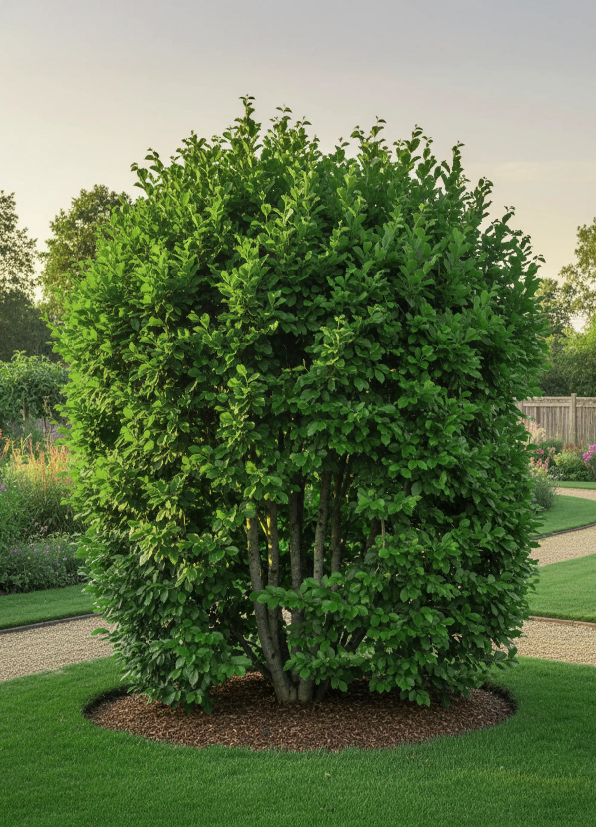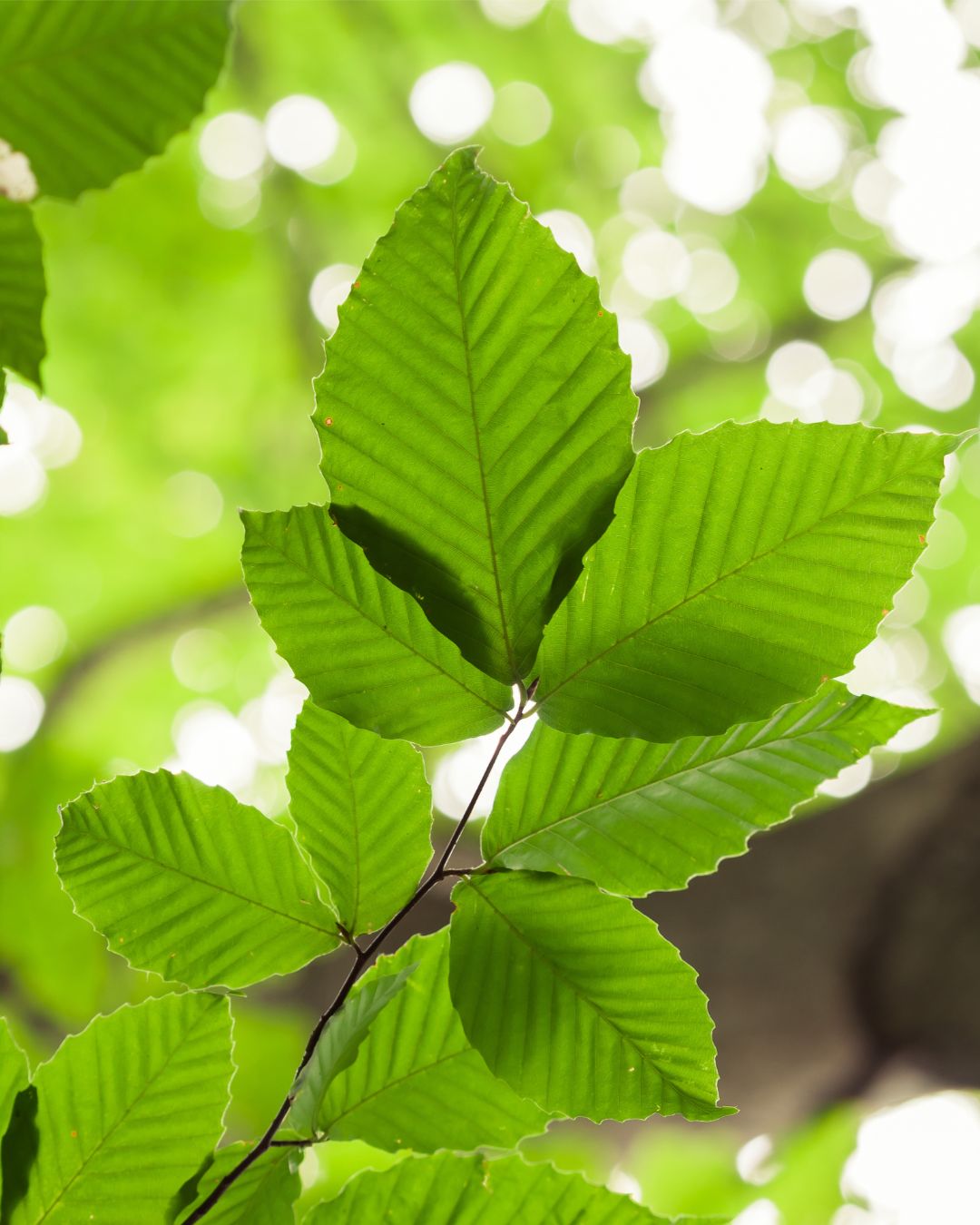 Ses feuilles ovales et nervurées, d’un vert brillant, virent progressivement au cuivré en automne. Leur texture légèrement ondulée et leur densité naturelle assurent une opacité durable, idéale pour créer des zones d’ombre et des haies protectrices.
