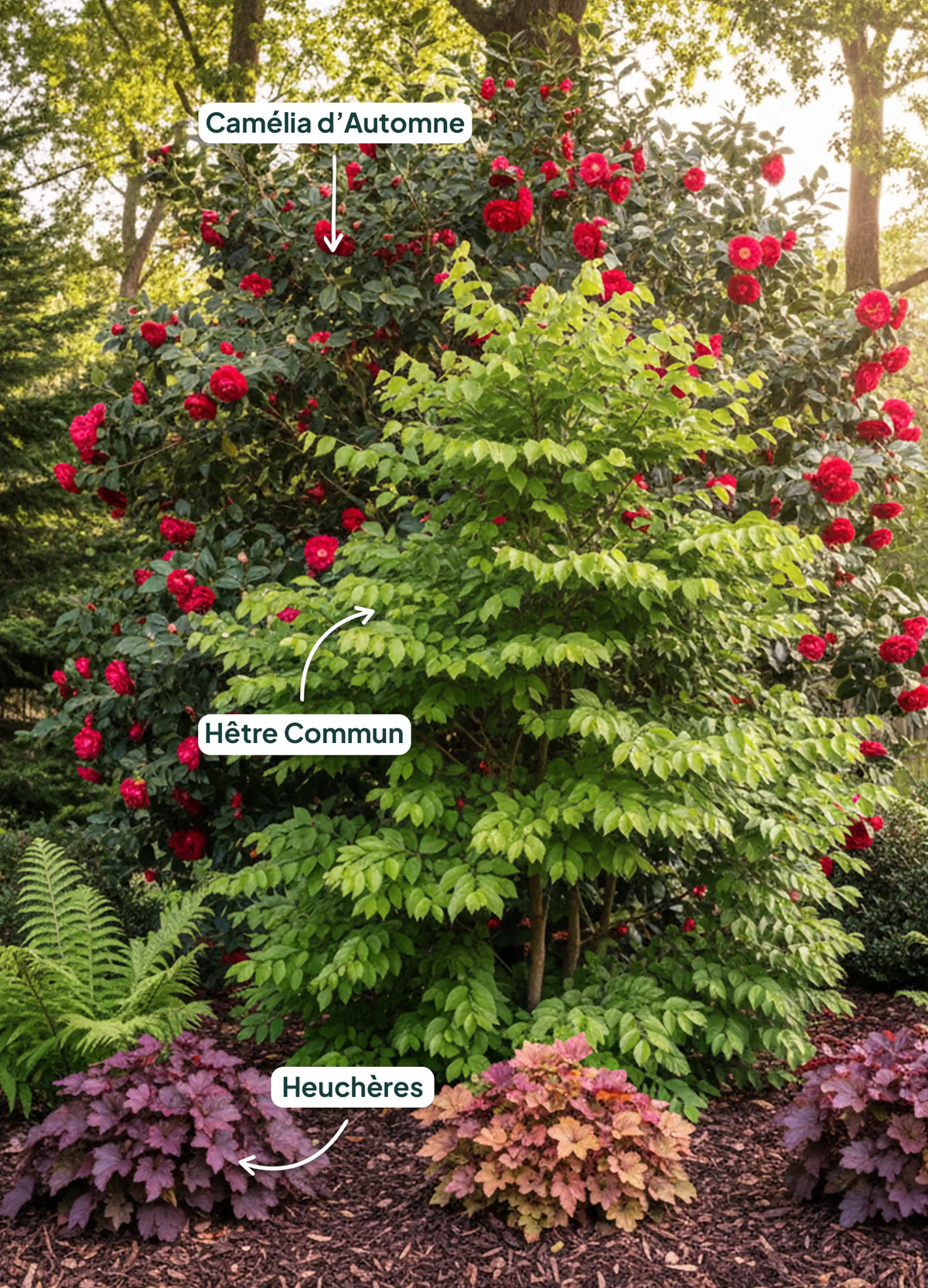 Le Hêtre se combine parfaitement avec les Erables, Charme, Cornouillers, Ifs, ainsi qu’avec des vivaces d’ombre comme fougères et hostas. Il crée des contrastes végétaux harmonieux dans les grands jardins ou les haies mixtes.