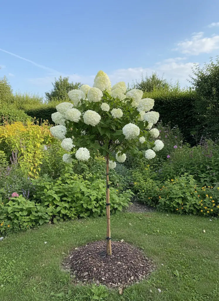 L’hortensia demi-tige, Hydrangea ornemental, présente un tronc court, une couronne arrondie, des fleurs généreuses et un feuillage luxuriant. Il est prisé pour ses boules florales, sa culture aisée, son intérêt décoratif et sa bonne rusticité en climat tempéré.