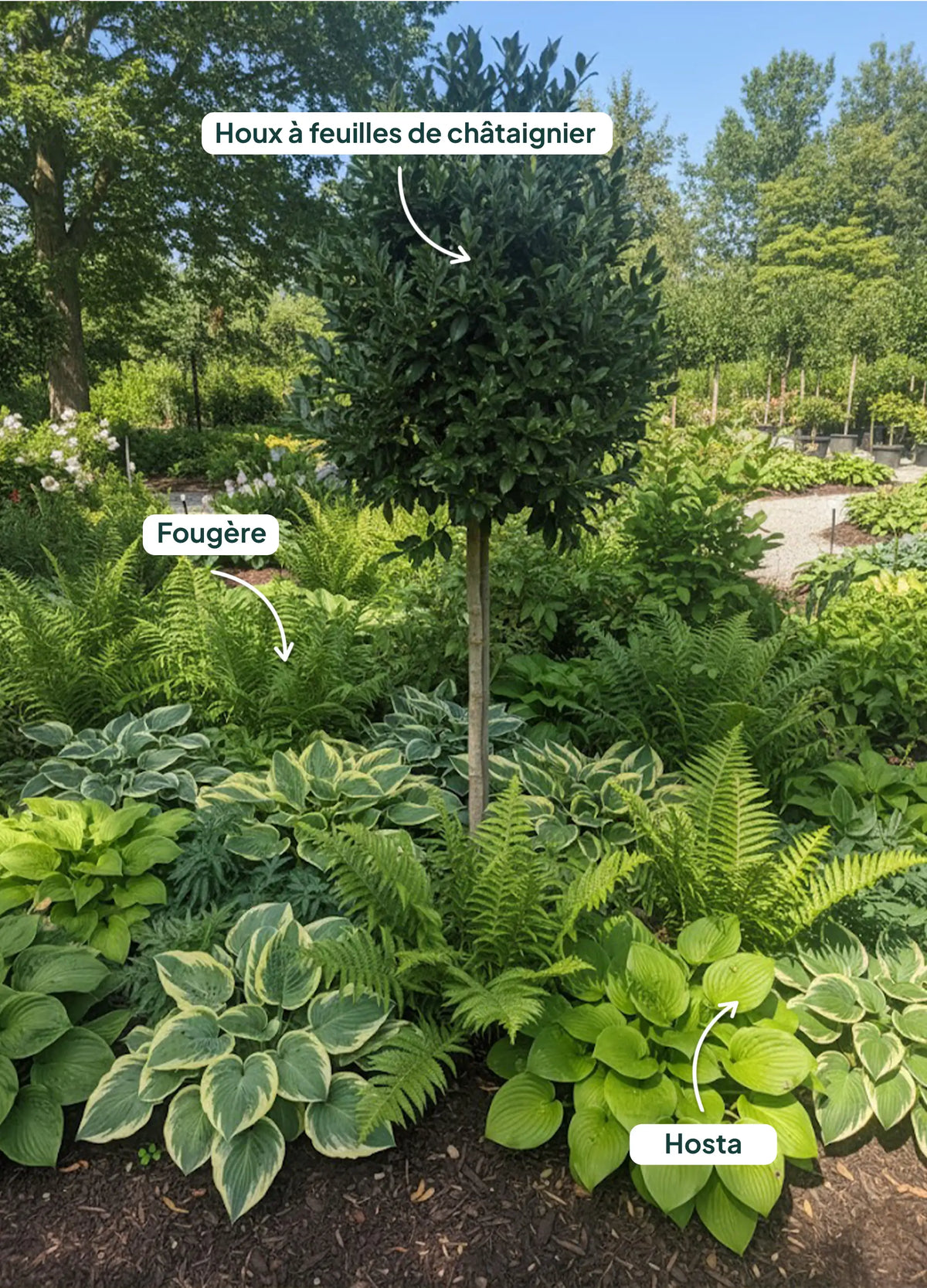 - Persistants : lauriers et photinias pour varier les tons.