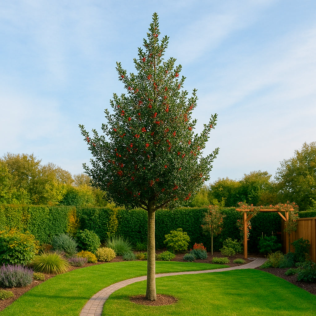 Le houx produit de petites fleurs blanches, discrètes mais mellifères, qui laissent place en automne à de nombreuses baies rouges décoratives. Ces fruits colorés persistent en hiver, apportant une touche de vitalité au jardin.