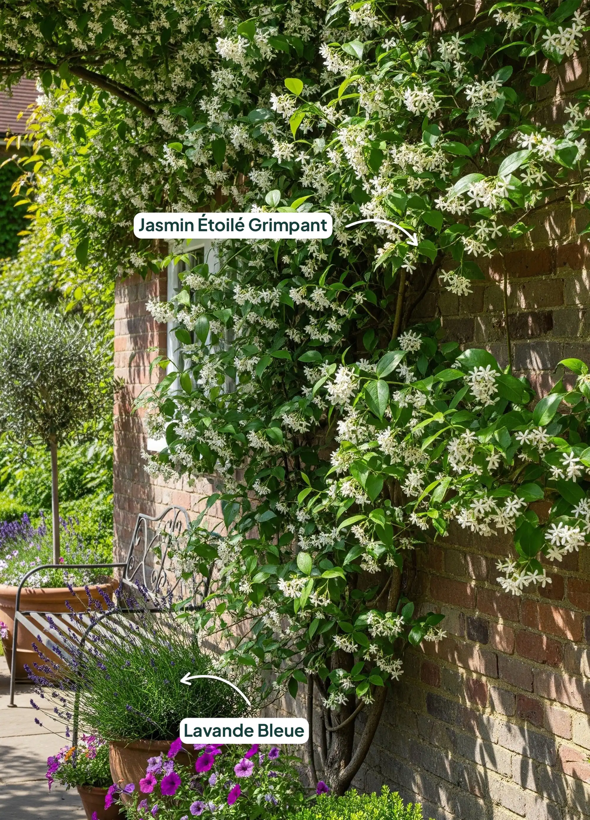 Associez-le avec des arbustes pour créer un écran parfumé :Le Jasmin Étoilé Grimpant est très prisé pour son parfum enchanteur et sa capacité à couvrir murs et pergolas. Associez-le à des arbustes pour une haie naturelle parfumée :