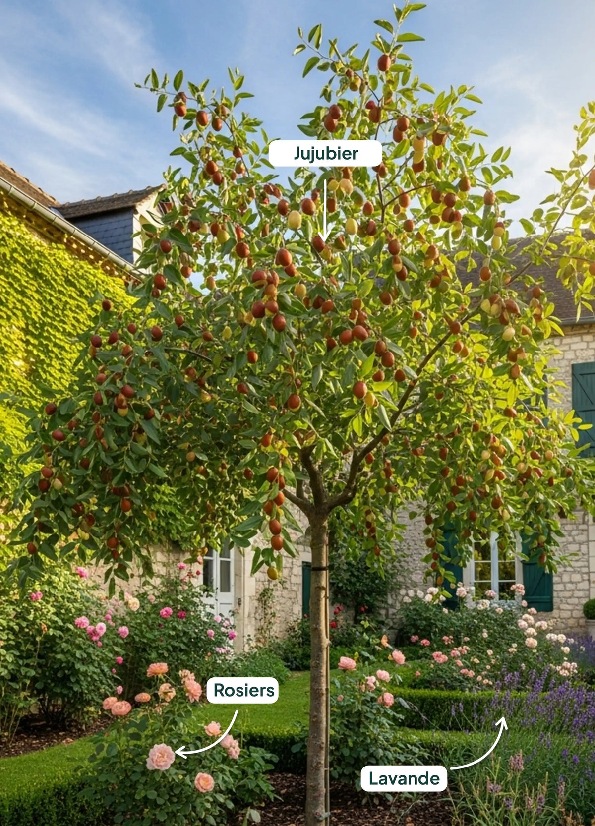 Le Jujubier (Ziziphus jujuba) est un arbre fruitier ancestral, originaire d’Asie, très apprécié pour ses fruits sucrés et nutritifs, les jujubes. Résistant à la sécheresse, il s’adapte parfaitement aux régions chaudes et ensoleillées. Sa croissance lente et sa longévité remarquable en font un choix idéal pour les jardins méditerranéens ou secs.