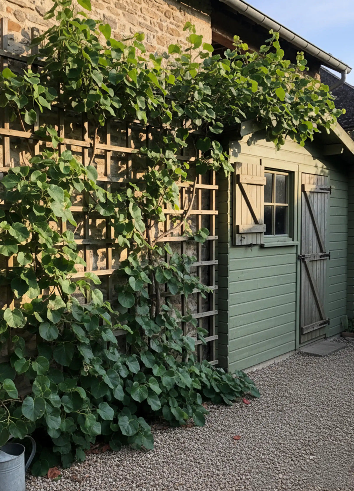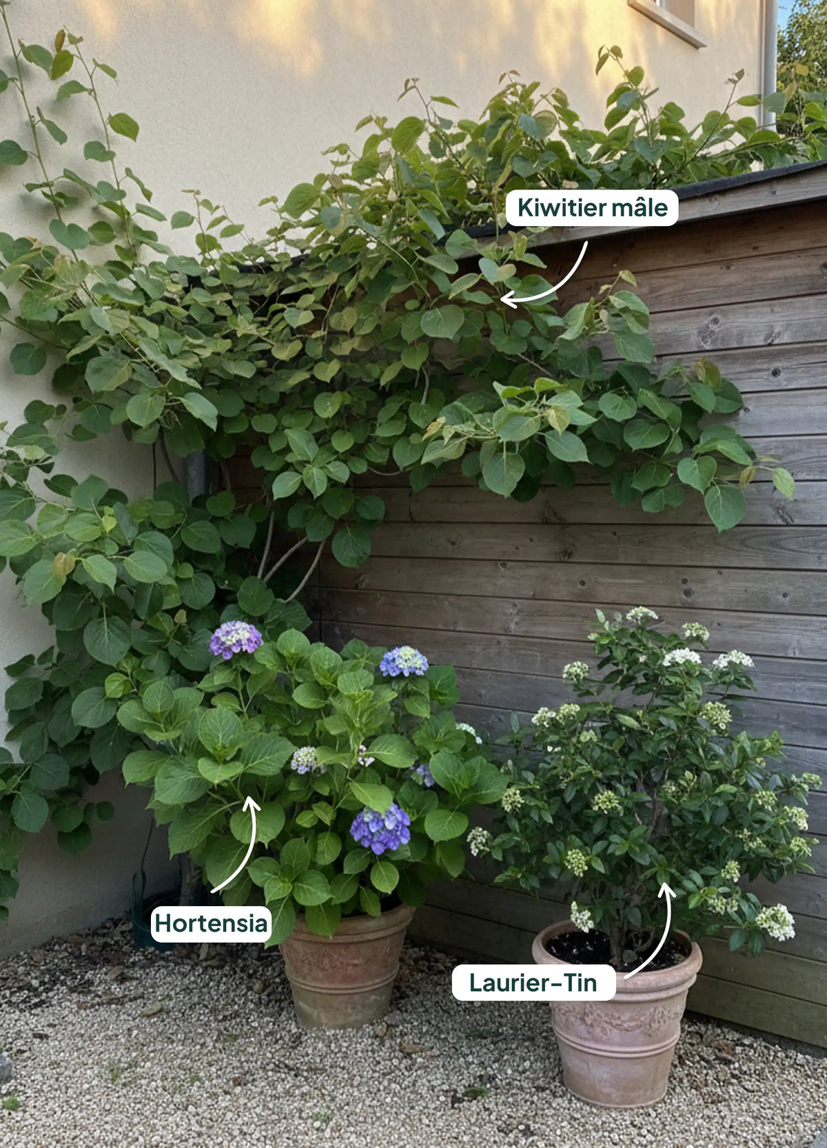 Associez-le avec des plantes grimpantes pour une structure variée :Le Kiwitier, idéal dans les jardins où la verticalité est exploitée, se plaît en compagnie d'autres grimpantes qui partagent ses besoins. Voici quelques suggestions :