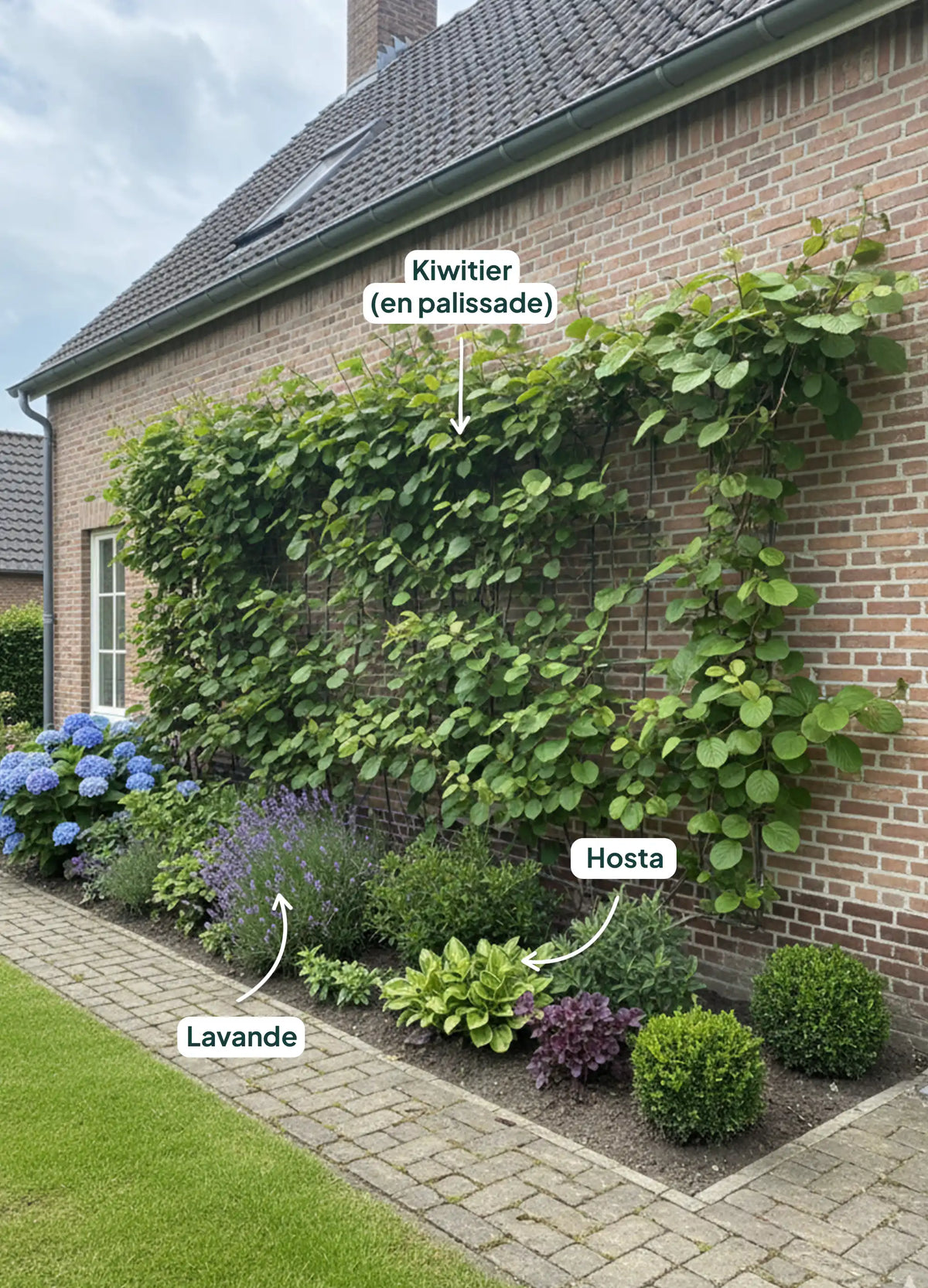 Associez-le avec des arbustes pour un soutien optimal :Le Kiwitier, grimpeur robuste et fruitier, nécessite un support solide pour croître. Associez-le à des arbustes structurants pour un jardin harmonieux et fonctionnel :