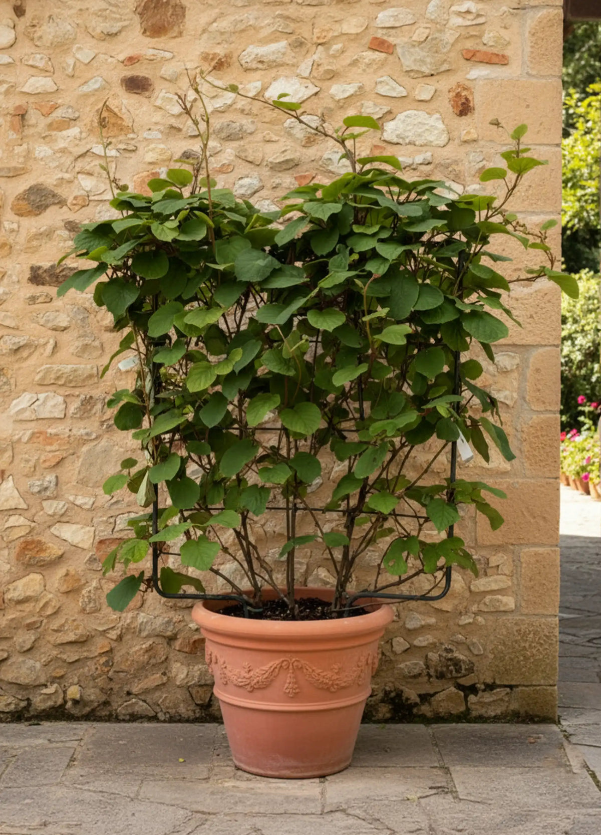 Le Kiwitier peut être cultivé en pot, surtout durant ses premières années. Rempotez tous les 2 à 3 ans au printemps pour accompagner sa croissance vigoureuse. Optez pour un pot large avec des trous de drainage, et un terreau riche et aéré. Ajoutez du sable pour améliorer le drainage. Arrosez régulièrement, sans excès, pour maintenir une humidité constante.