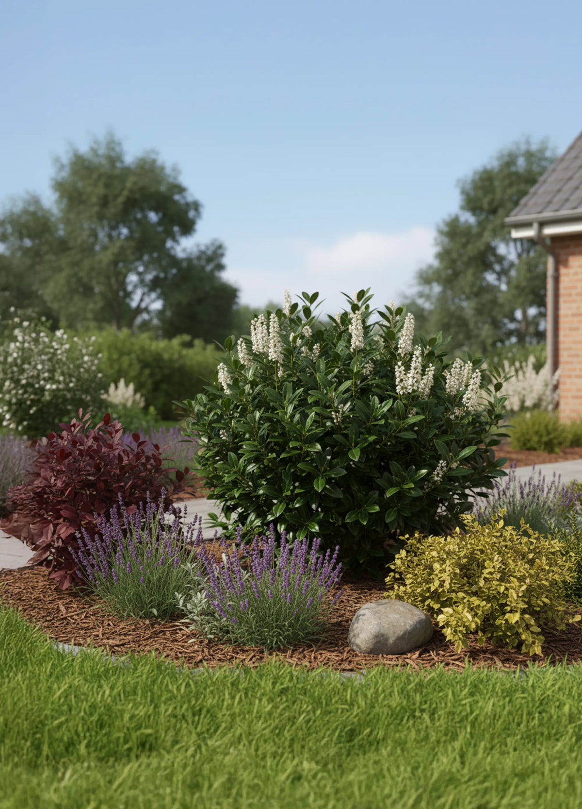 - Le Berberis (Berberis thunbergii) : Dispose d'un feuillage rougeâtre et épineux qui met en valeur le vert profond du Laurier du Portugal.