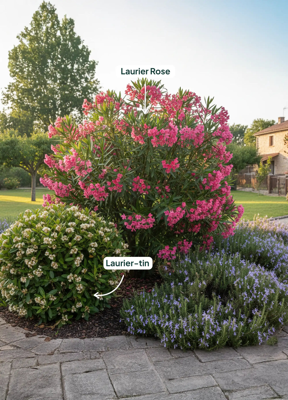 Associez-le avec des arbustes pour des massifs exubérants :Le *Laurier Rose* est connu pour sa floraison longue et abondante. Pour créer un massif luxuriant, combinez-le à d'autres arbustes qui rehausseront ses couleurs vives :